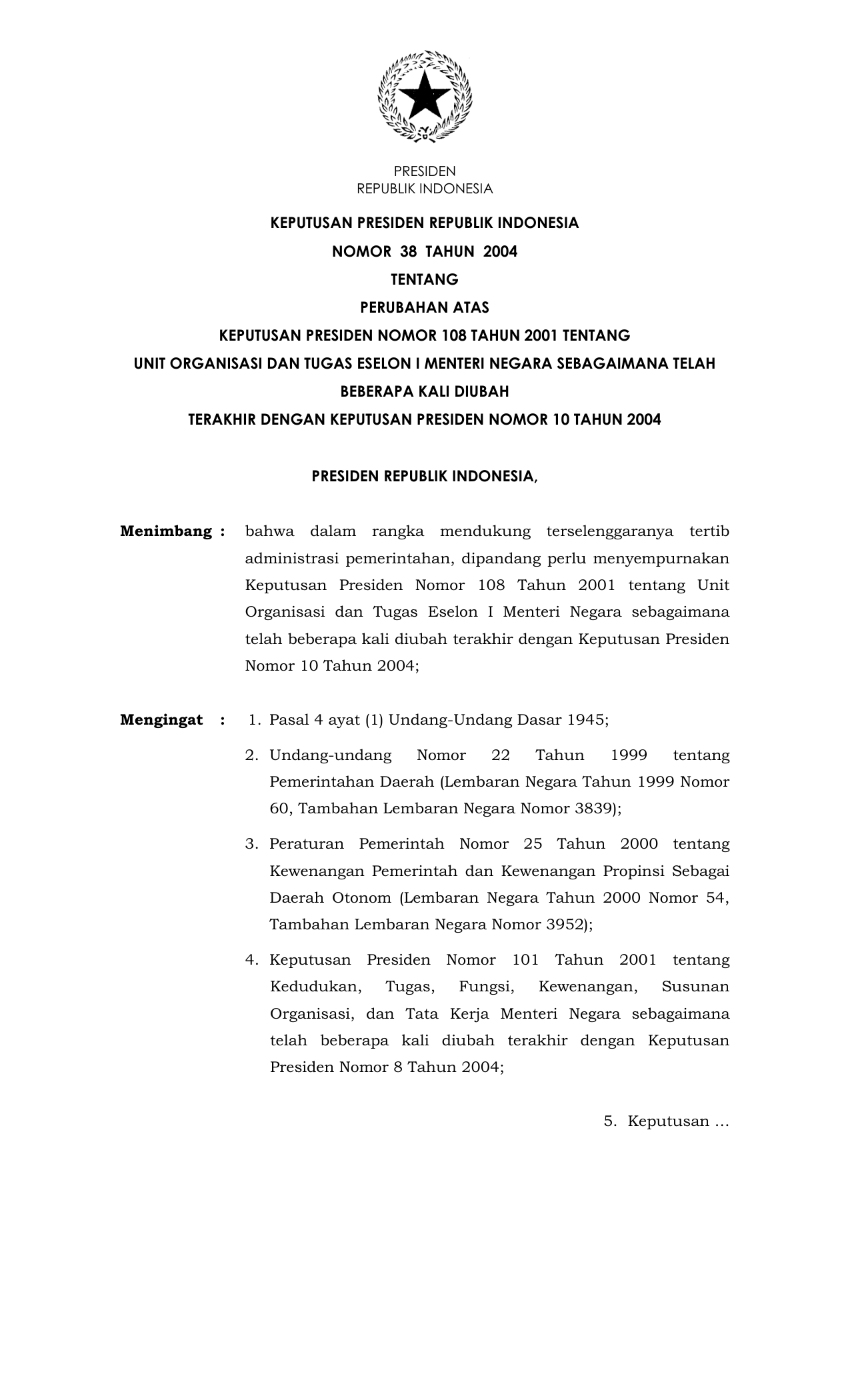 KEPPRES Nomor 38 Tahun 2004 | Keputusan Presiden Nomor 38 Tahun 2004 tentang PERUBAHAN ATAS KEPUTUSAN PRESIDEN NOMOR 108 TAHUN 2001 TENTANG UNIT ORGANISASI DAN TUGAS ESELON I MENTERI NEGARA SEBAGAIMANA TELAH BEBERAPA KALI DIUBAH TERAKHIR DENGAN KEPUTUSAN PRESIDEN NOMOR 10 TAHUN 2004