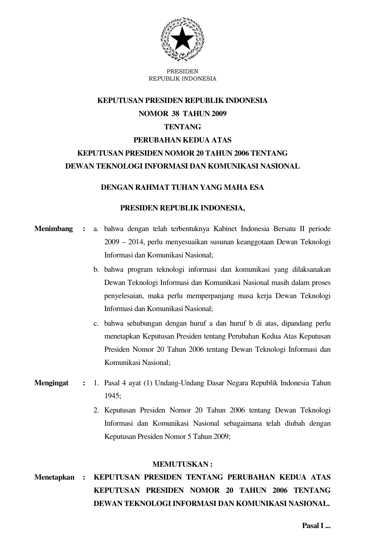 KEPPRES Nomor 38 Tahun 2009 | Keputusan Presiden Nomor 38 Tahun 2009 tentang PERUBAHAN KEDUA ATAS KEPUTUSAN PRESIDEN NOMOR 20 TAHUN 2006 TENTANG DEWAN TEKNOLOGI INFORMASI DAN KOMUNIKASI NASIONAL