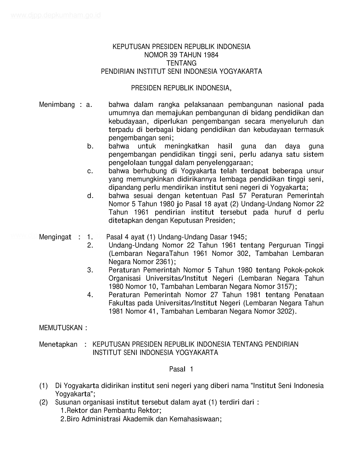 KEPPRES Nomor 39 Tahun 1984 | Keputusan Presiden Nomor 39 Tahun 1984 tentang PENDIRIAN INSTITUT SENI INDONESIA YOGYAKARTA