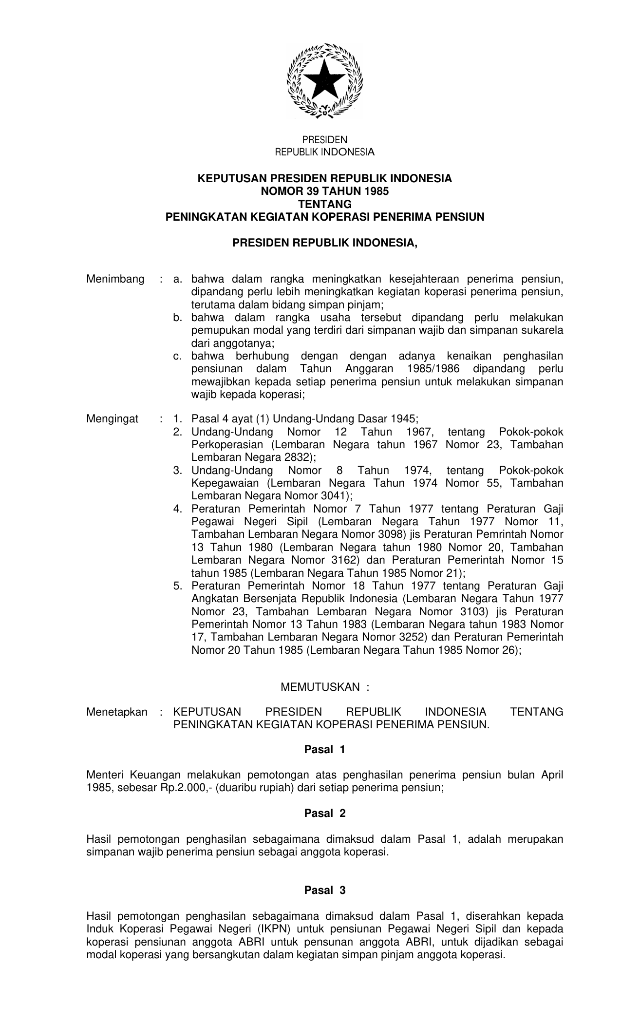 KEPPRES Nomor 39 Tahun 1985 | Keputusan Presiden Nomor 39 Tahun 1985 tentang PENINGKATAN KEGIATAN KOPERASI PENINGKATAN PENSIUN