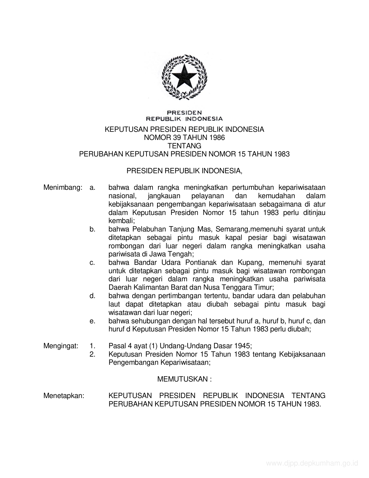 KEPPRES Nomor 39 Tahun 1986 | Keputusan Presiden Nomor 39 Tahun 1986 tentang PERUBAHAN KEPUTUSAN PRESIDEN NOMOR 15 TAHUN 1983 TENTANG KEBIJAKSANAAN PENGEMBANGAN KEPARIWISATAAN