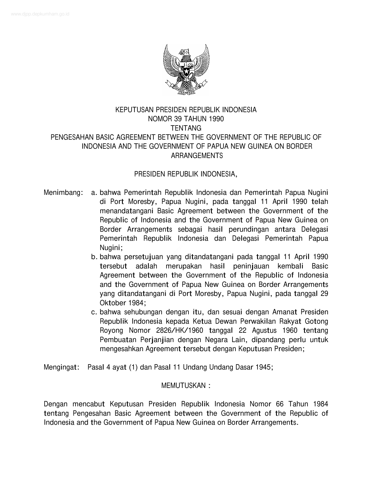KEPPRES Nomor 39 Tahun 1990 | Keputusan Presiden Nomor 39 Tahun 1990 tentang PENGESAHAN BASIC AGREEMENT BETWEEN THE GOVERNMENT OF THE REPUBLIC OF INDONESIA AND THE GOVERNMENT OF PAPUA NEW GUINEA ON BORDER ARRANGEMENTS