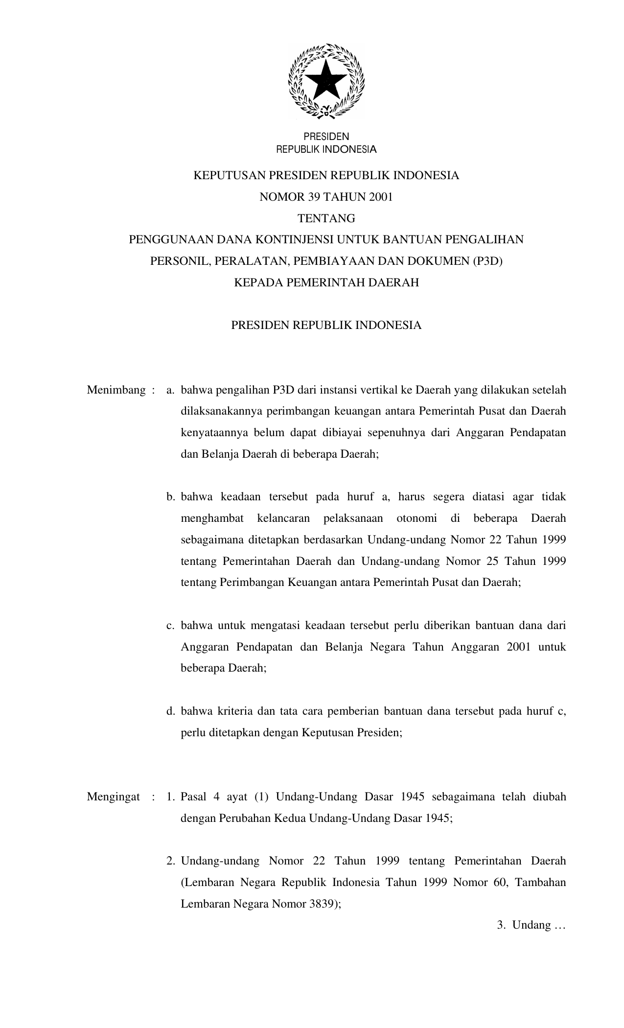 KEPPRES Nomor 39 Tahun 2001 | Keputusan Presiden Nomor 39 Tahun 2001 tentang PENGGUNAAN DANA KONTIJENSI UNTUK BANTUAN PENGALIHAN PERSONIL, PERALATAN, PEMBIAYAAN DAN DOKUMEN (P3D) KEPADA PEMERINTAH DAERAH