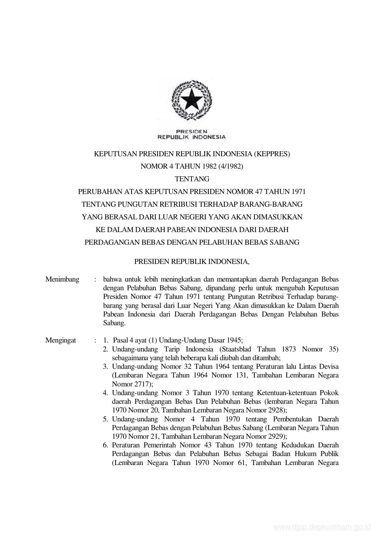 KEPPRES Nomor 4 Tahun 1982 | Keputusan Presiden Nomor 4 Tahun 1982 tentang PERUBAHAN KEPPRES 47-1971 TENTANG PUNGUTAN RETRIBUSI TERHADAP BARANG-BARANG YANG BERASAL DARI LUAR NEGERI YANG AKAN DIMASUKKAN KE DALAM DAERAH PABEAN INDONESIA DARI DAERAH PERDAGANGAN BEBAS DENGAN PELABUHAN BEBAS SABANG