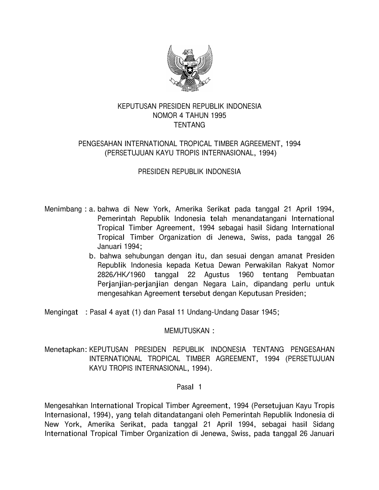KEPPRES Nomor 4 Tahun 1995 | Keputusan Presiden Nomor 4 Tahun 1995 tentang PENGESAHAN INTERNATIONAL TROPICAL TIMBER AGREEMENT 1994 (PERSETUJUAN KAYU TROPIS INTERNASIONAL)