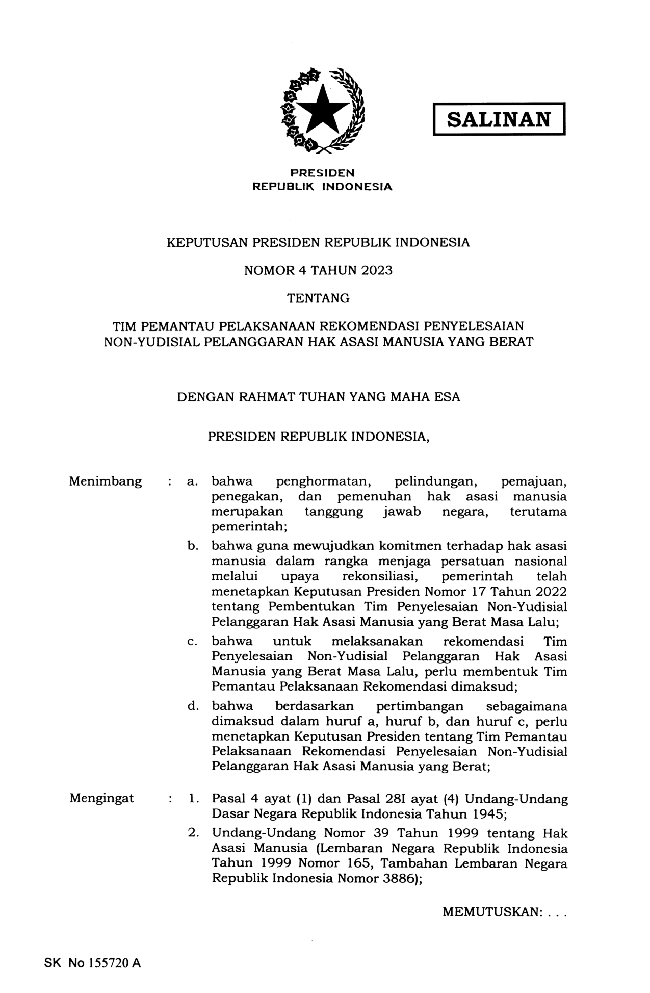 KEPPRES Nomor 4 Tahun 2023 | Keputusan Presiden Nomor 4 Tahun 2023 tentang TIM PEMANTAU PELAKSANAAN REKOMENDASI PENYELESAIANNON-YUDISIAL PELANGGARAN HAK ASASI MANUSIA YANG BERAT