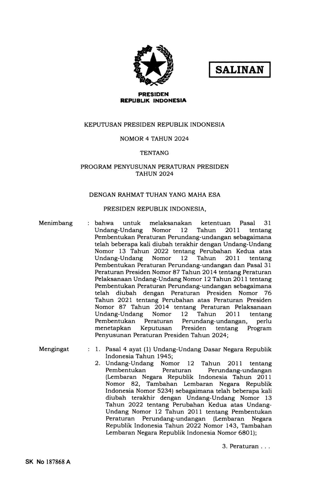 KEPPRES Nomor 4 Tahun 2024 | Keputusan Presiden Nomor 4 Tahun 2024 tentang PROGRAM PENYUSUNAN PERATURAN PRESIDEN TAHUN 2024