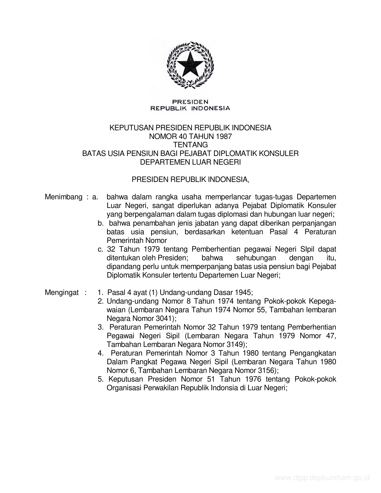 KEPPRES Nomor 40 Tahun 1987 | Keputusan Presiden Nomor 40 Tahun 1987 tentang BATAS USIA PENSIUN BAGI PEJABAT DIPLOMATIK KONSULER DEPARTEMEN LUAR NEGERI