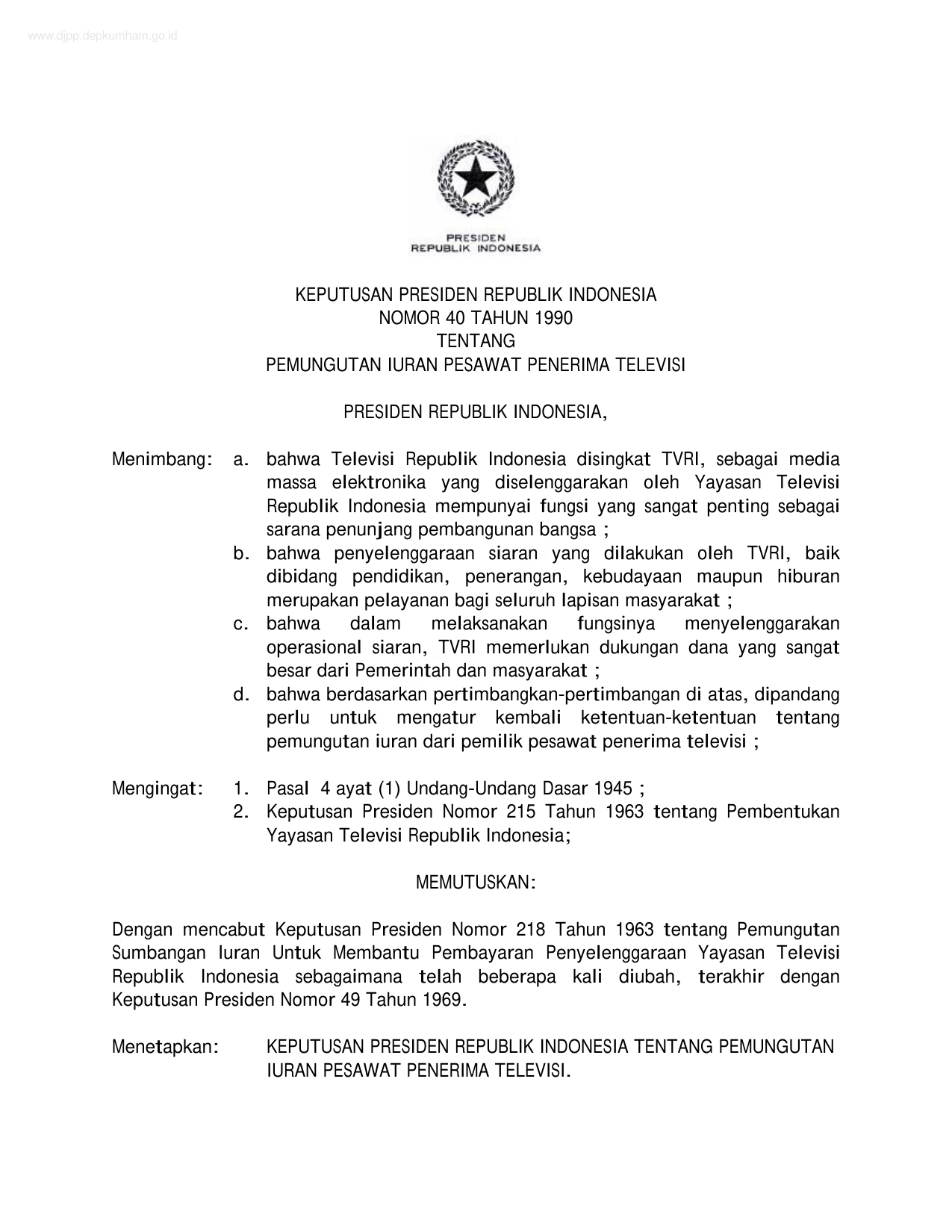 KEPPRES Nomor 40 Tahun 1990 | Keputusan Presiden Nomor 40 Tahun 1990 tentang PEMUNGUTAN IURAN PESAWAT PENERIMA TELEVISI