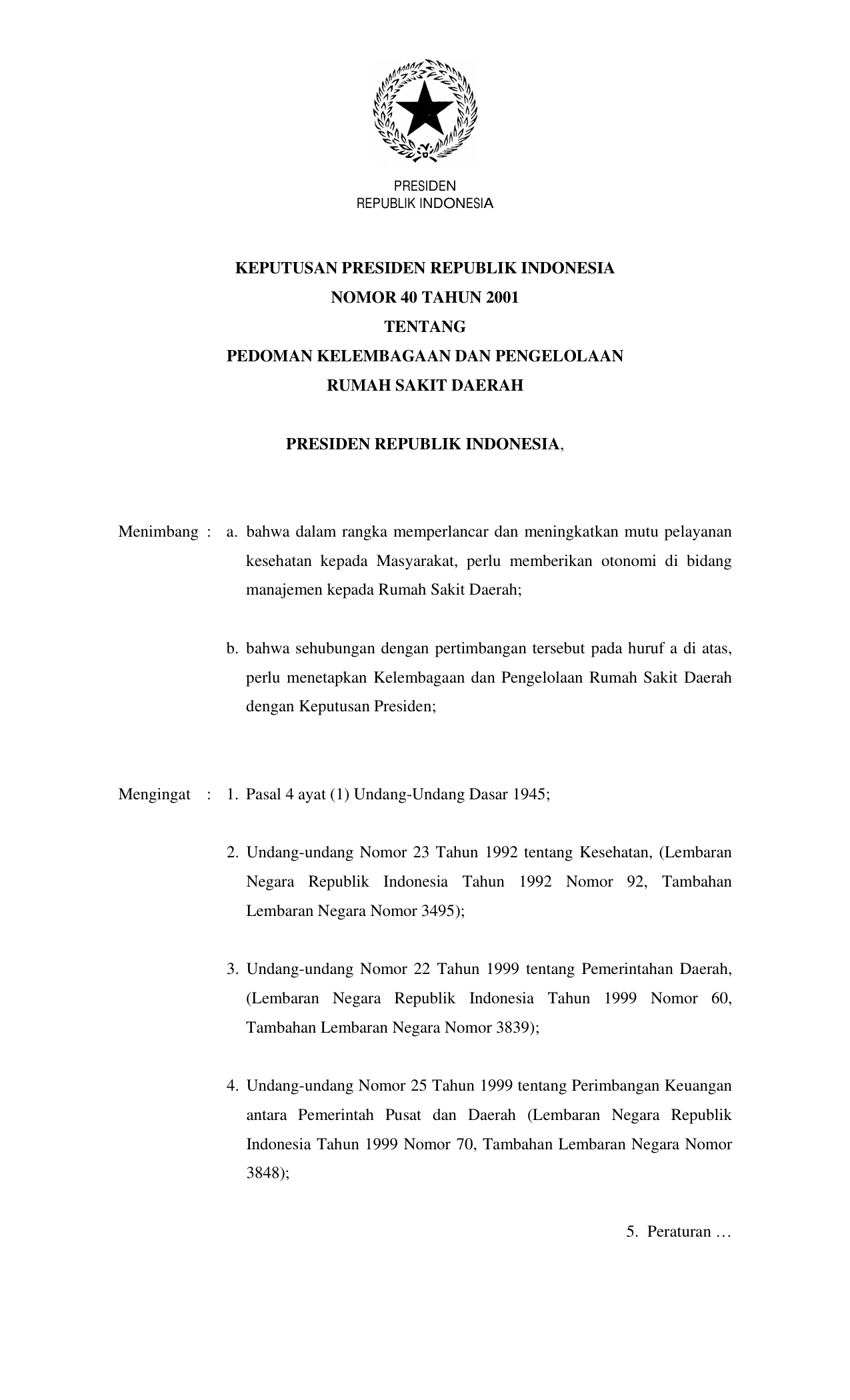 KEPPRES Nomor 40 Tahun 2001 | Keputusan Presiden Nomor 40 Tahun 2001 tentang PEDOMAN KELEMBAGAAN DAN PENGELOLAAN RUMAH SAKIT DAERAH