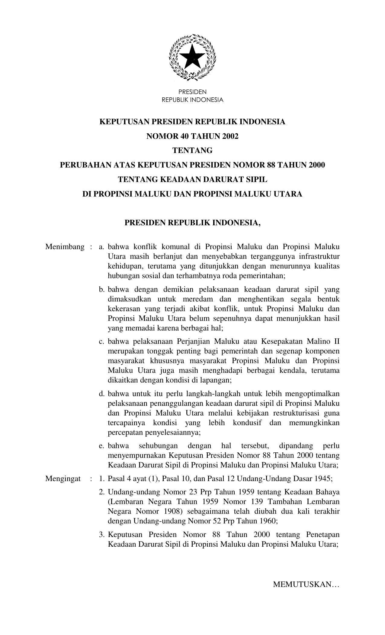 KEPPRES Nomor 40 Tahun 2002 | Keputusan Presiden Nomor 40 Tahun 2002 tentang PERUBAHAN KEPPRES 88-2000 TENTANG KEADAAN DARURAT SIPIL DI PROPINSI MALUKU DAN PROPINSI MALUKU UTARA