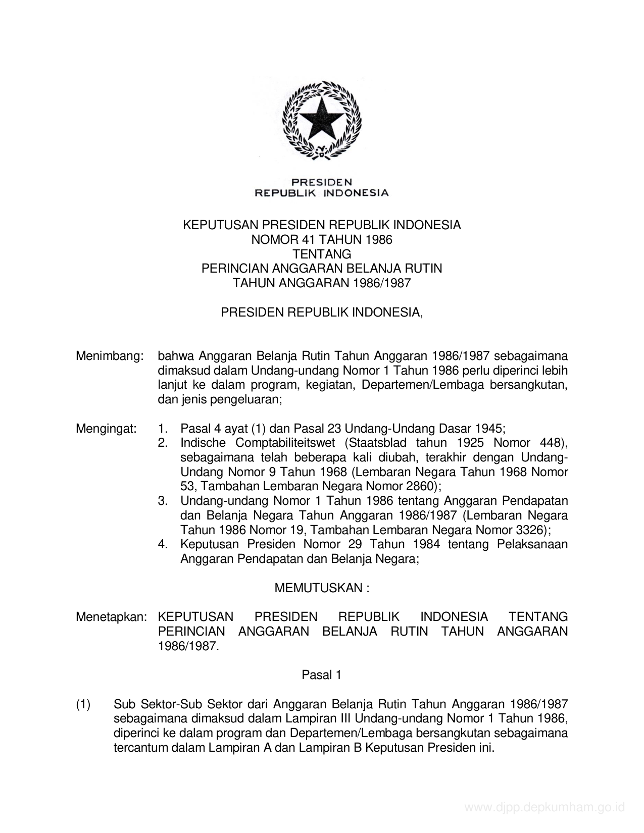 KEPPRES Nomor 41 Tahun 1986 | Keputusan Presiden Nomor 41 Tahun 1986 tentang PERINCIAN ANGGARAN BELANJA RUTIN TAHUN ANGGARAN 1986/1987