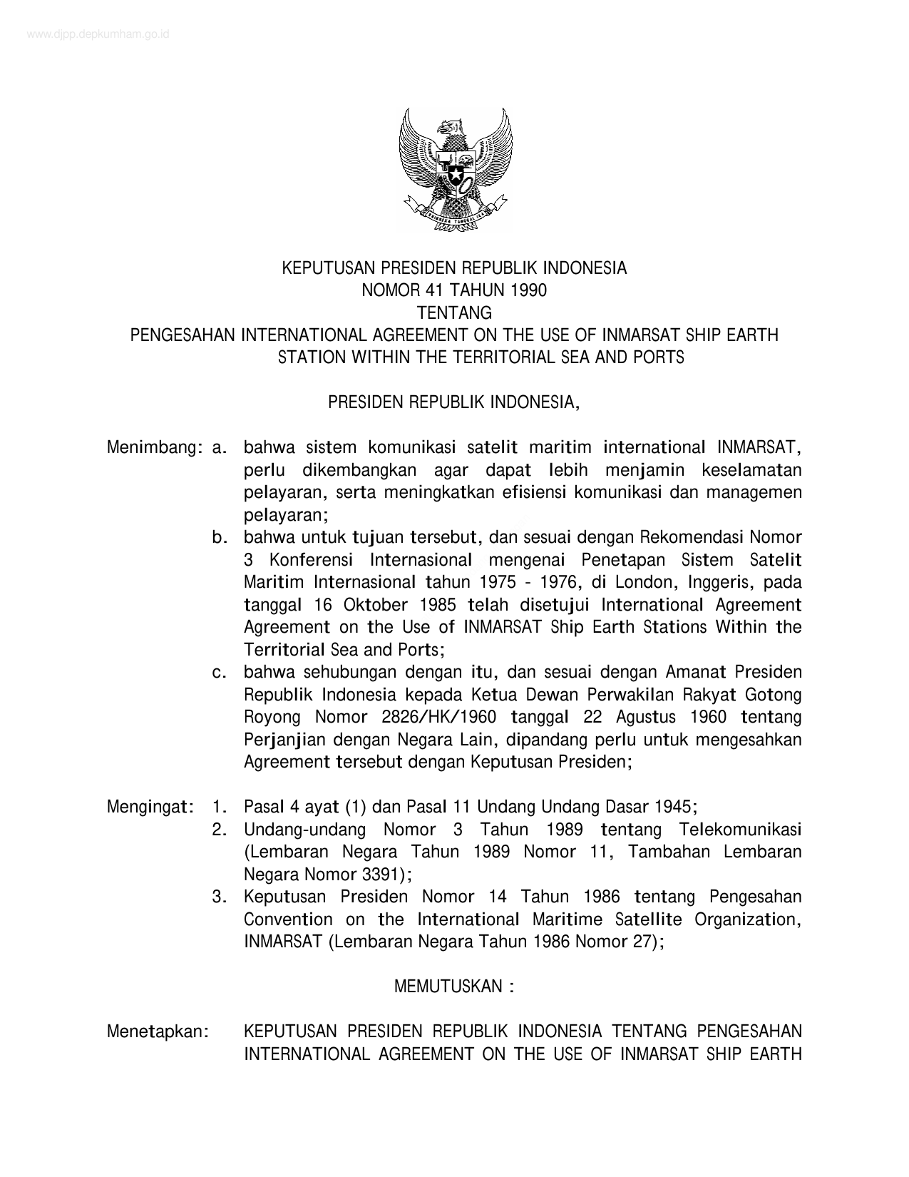 KEPPRES Nomor 41 Tahun 1990 | Keputusan Presiden Nomor 41 Tahun 1990 tentang PENGESAHAN INTERNATIONAL AGREEMENT ON THE USE OF INMARSAT SHIP EARTH STATION WITHIN THE TERRITORIAL SEA AND PORTS