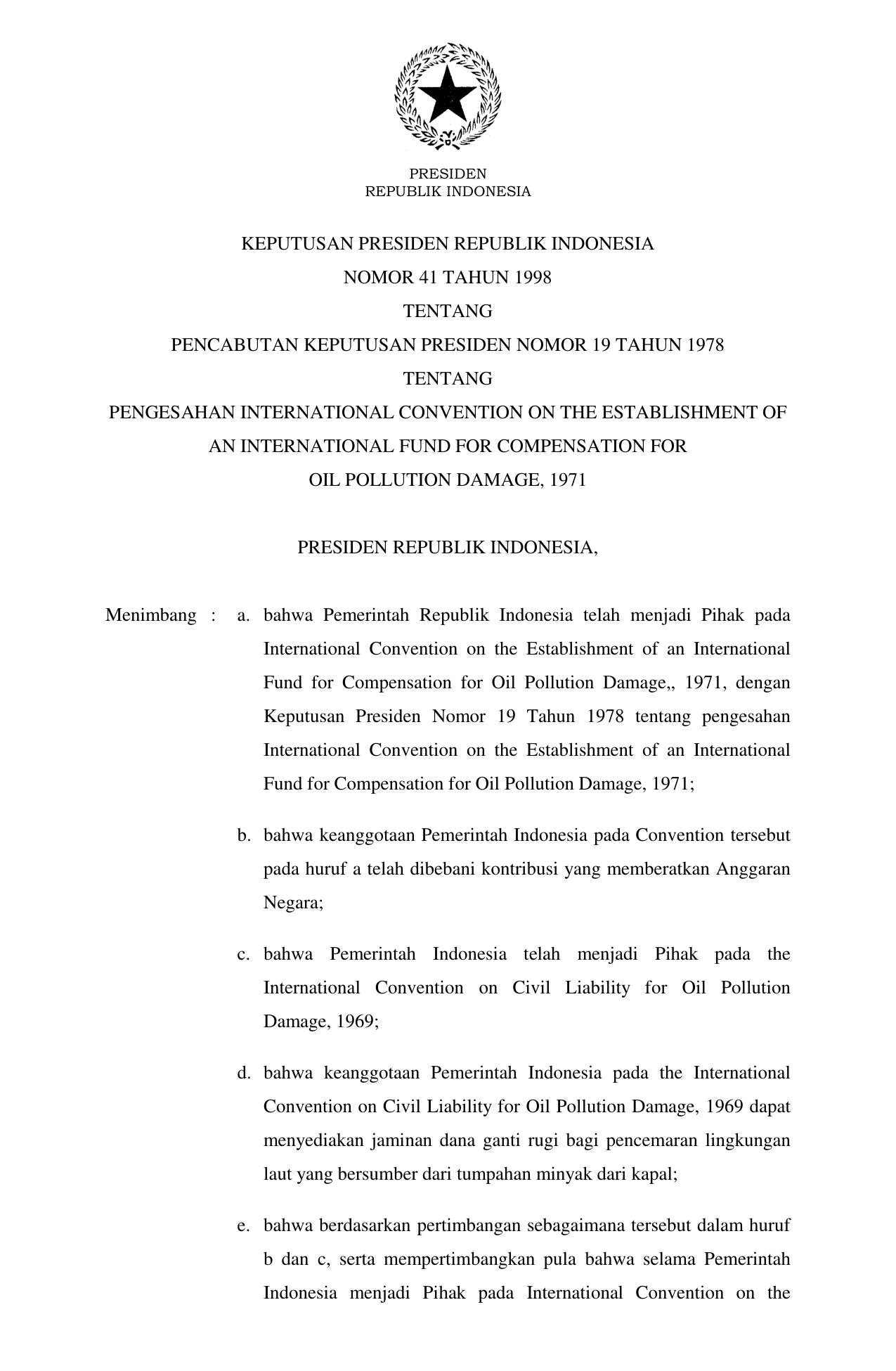KEPPRES Nomor 41 Tahun 1998 | Keputusan Presiden Nomor 41 Tahun 1998 tentang PENCABUTAN KEPPRES 19-1978 TENTANG PENGESAHAN INTERNATIONAL CONVENTION ON THE ESTABLISHMENT OF AN INTERNATIONAL FUND FOR COMPENSATION FOR OIL POLLUTION DAMAGE, 1972