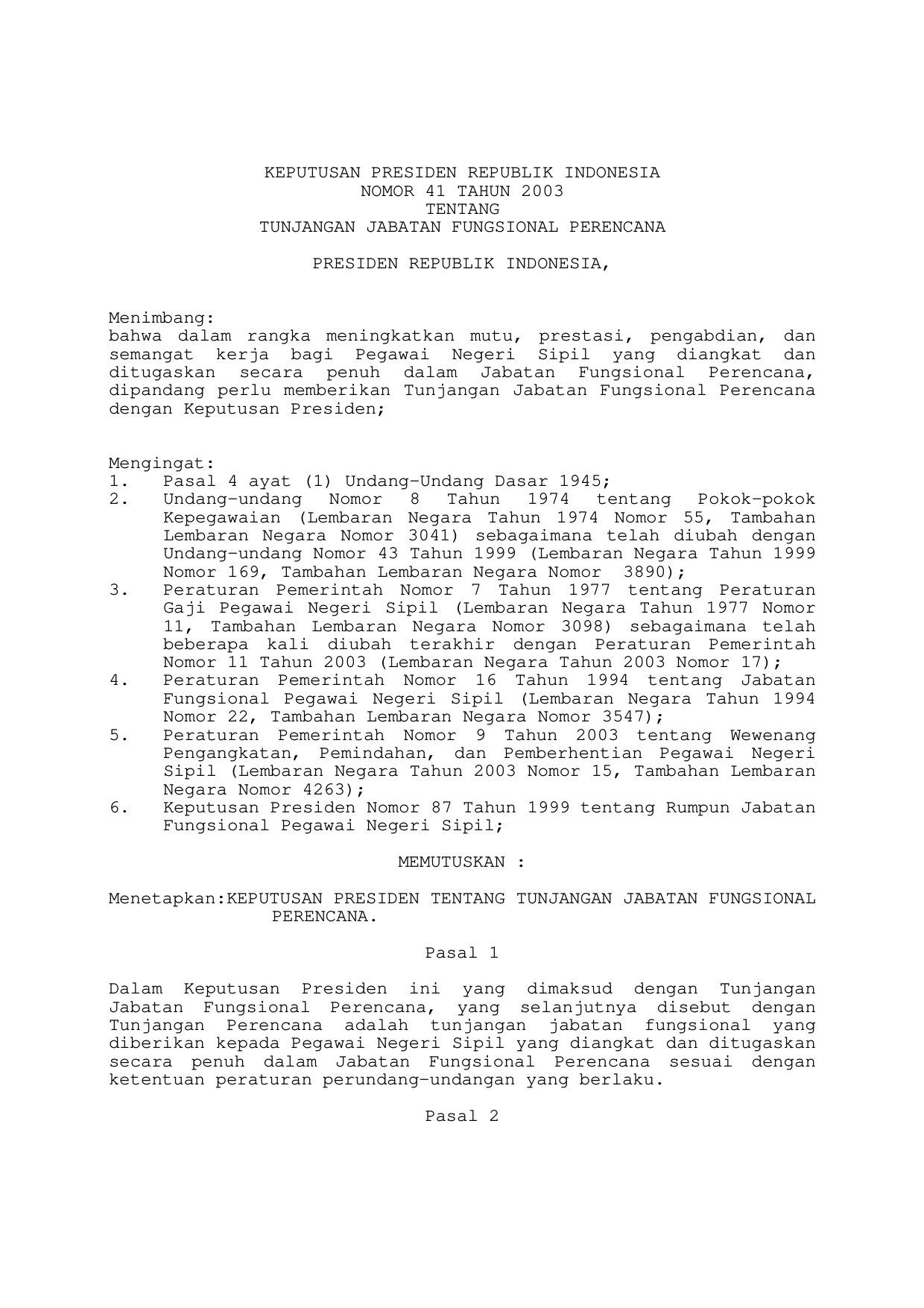 KEPPRES Nomor 41 Tahun 2003 | Keputusan Presiden Nomor 41 Tahun 2003 tentang TUNJANGAN JABATAN FUNGSIONAL PERENCANA
