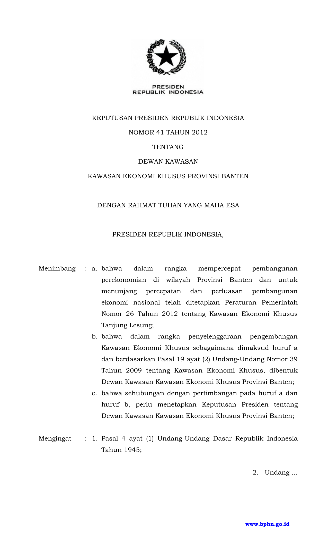 KEPPRES Nomor 41 Tahun 2012 | Keputusan Presiden Nomor 41 Tahun 2012 tentang DEWAN KAWASAN KAWASAN EKONOMI KHUSUS PROVINSI BANTEN