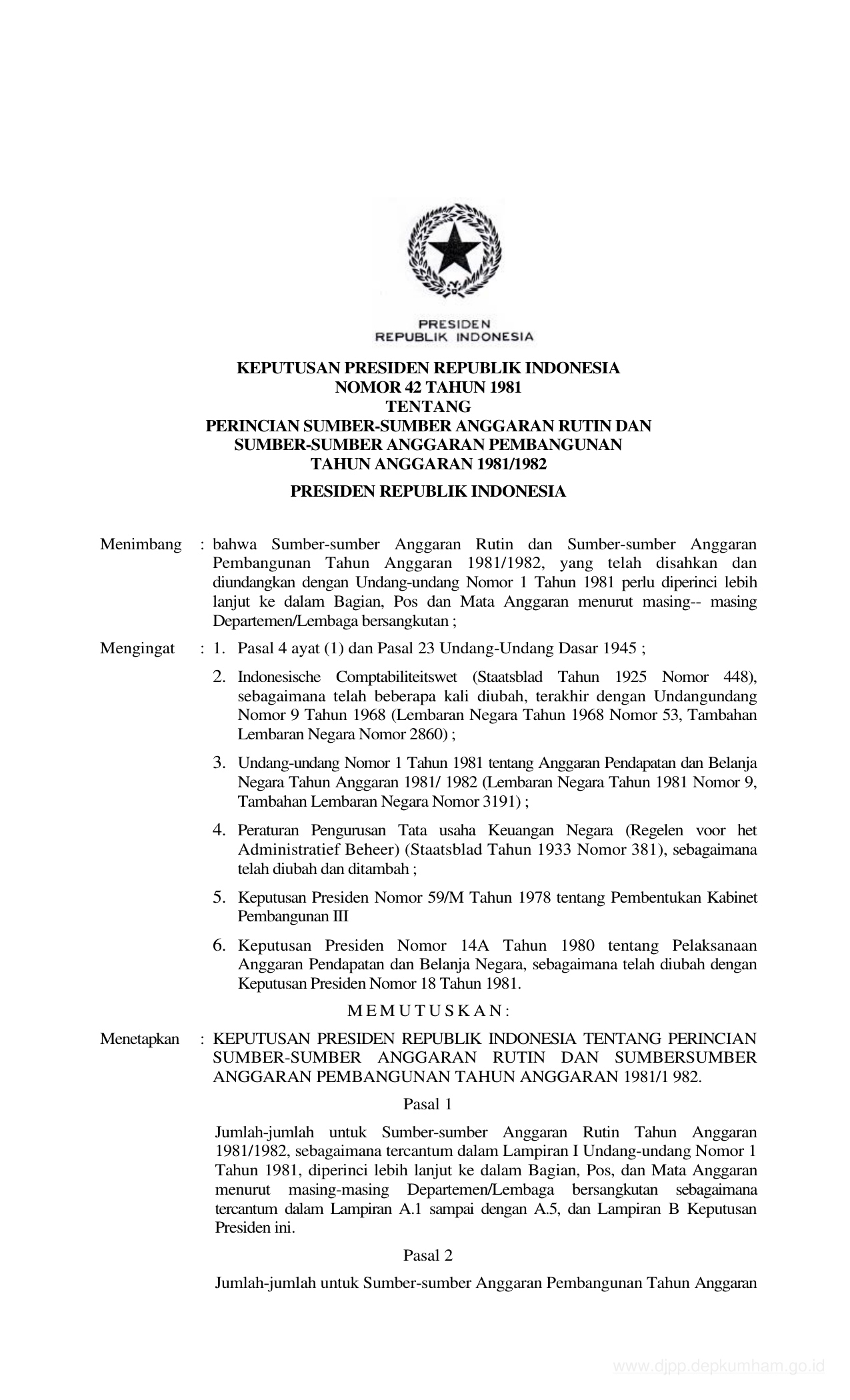 KEPPRES Nomor 42 Tahun 1981 | Keputusan Presiden Nomor 42 Tahun 1981 tentang PERINCIAN SUMBER-SUMBER ANGGARAN RUTIN DAN SUMBER-SUMBER ANGGARAN PEMBANGUNAN TAHUN ANGGARAN 1982/1982