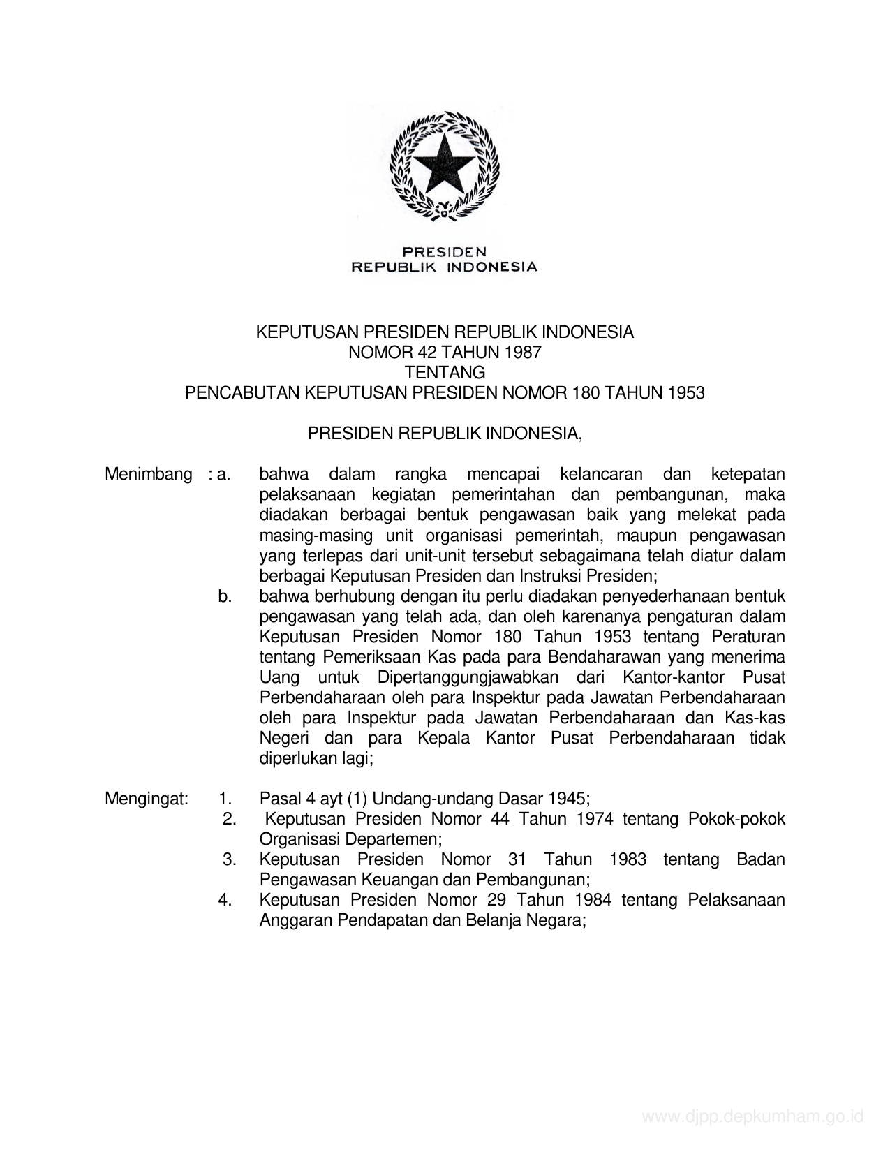 KEPPRES Nomor 42 Tahun 1987 | Keputusan Presiden Nomor 42 Tahun 1987 tentang PENCABUTAN KEPUTUSAN PRESIDEN NOMOR 180 TAHUN 1953