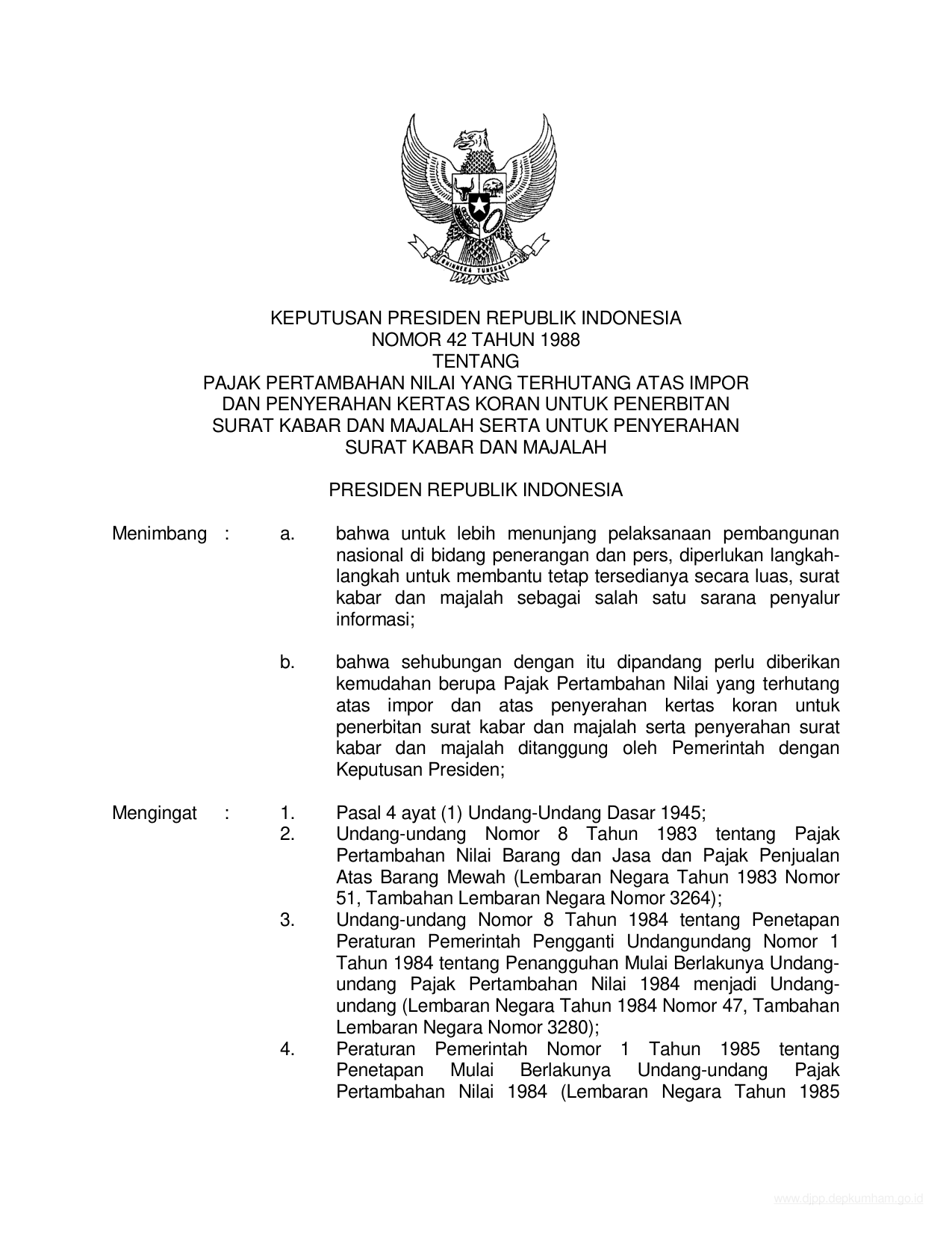 KEPPRES Nomor 42 Tahun 1988 | Keputusan Presiden Nomor 42 Tahun 1988 tentang PAJAK PERTAMBAHAN NILAI YANG TERHITUNG ATAS IMPOR DAN PENYERAHAN KERTAS KORAN UNTUK PENERBITAN SURAT KABAR DAN MAJALAH SERTA UNTUK PENYERAHAN SURAT KABAR DAN MAJALAH