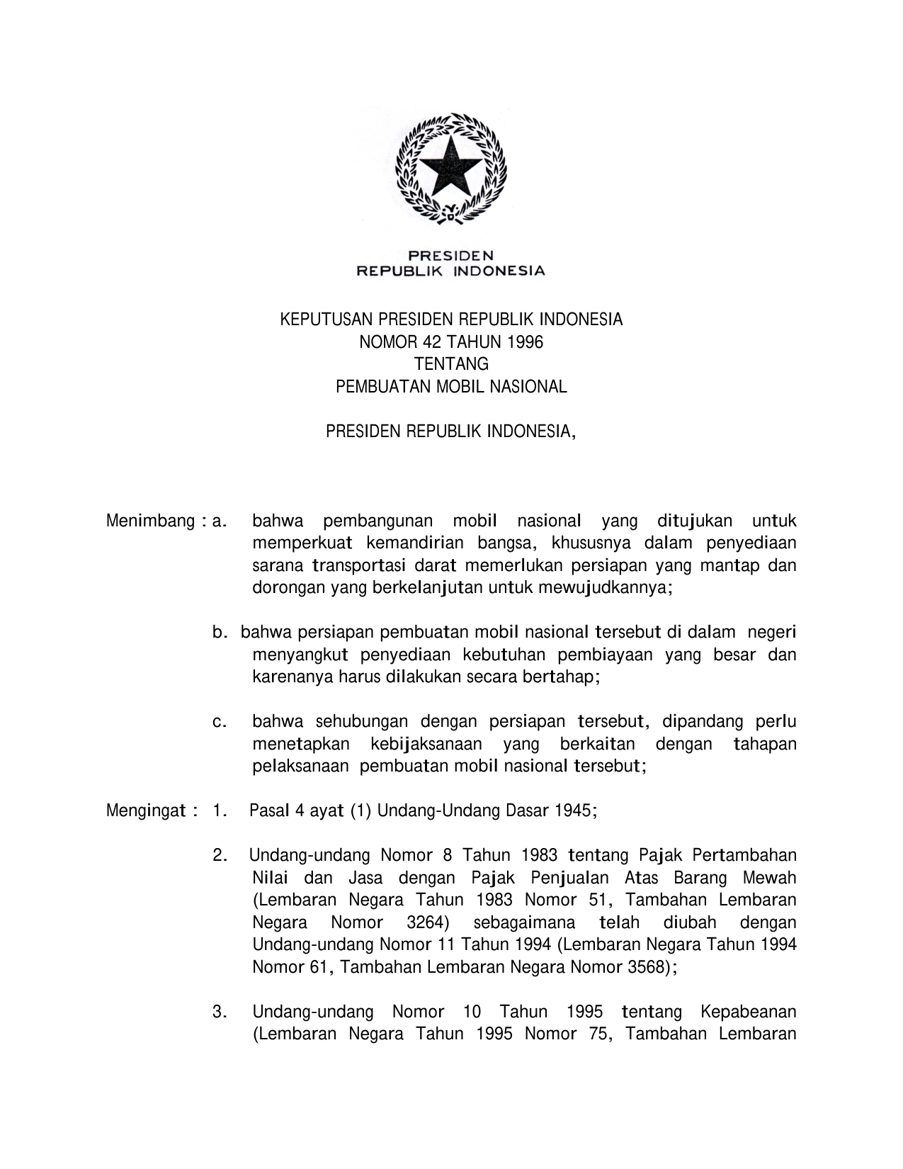 KEPPRES Nomor 42 Tahun 1996 | Keputusan Presiden Nomor 42 Tahun 1996 tentang PEMBUATAN MOBIL NASIONAL