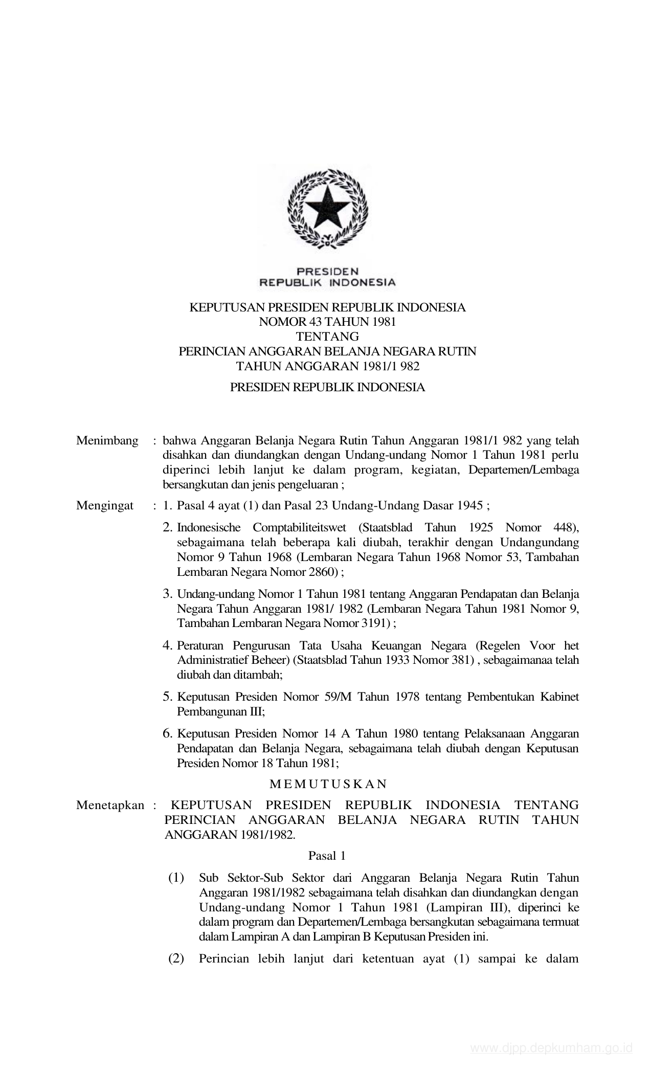KEPPRES Nomor 43 Tahun 1981 | Keputusan Presiden Nomor 43 Tahun 1981 tentang PERINCIAN ANGGARAN BELANJA NEGARA PEMBANGUNAN TAHUN ANGGARAN 1982/1982