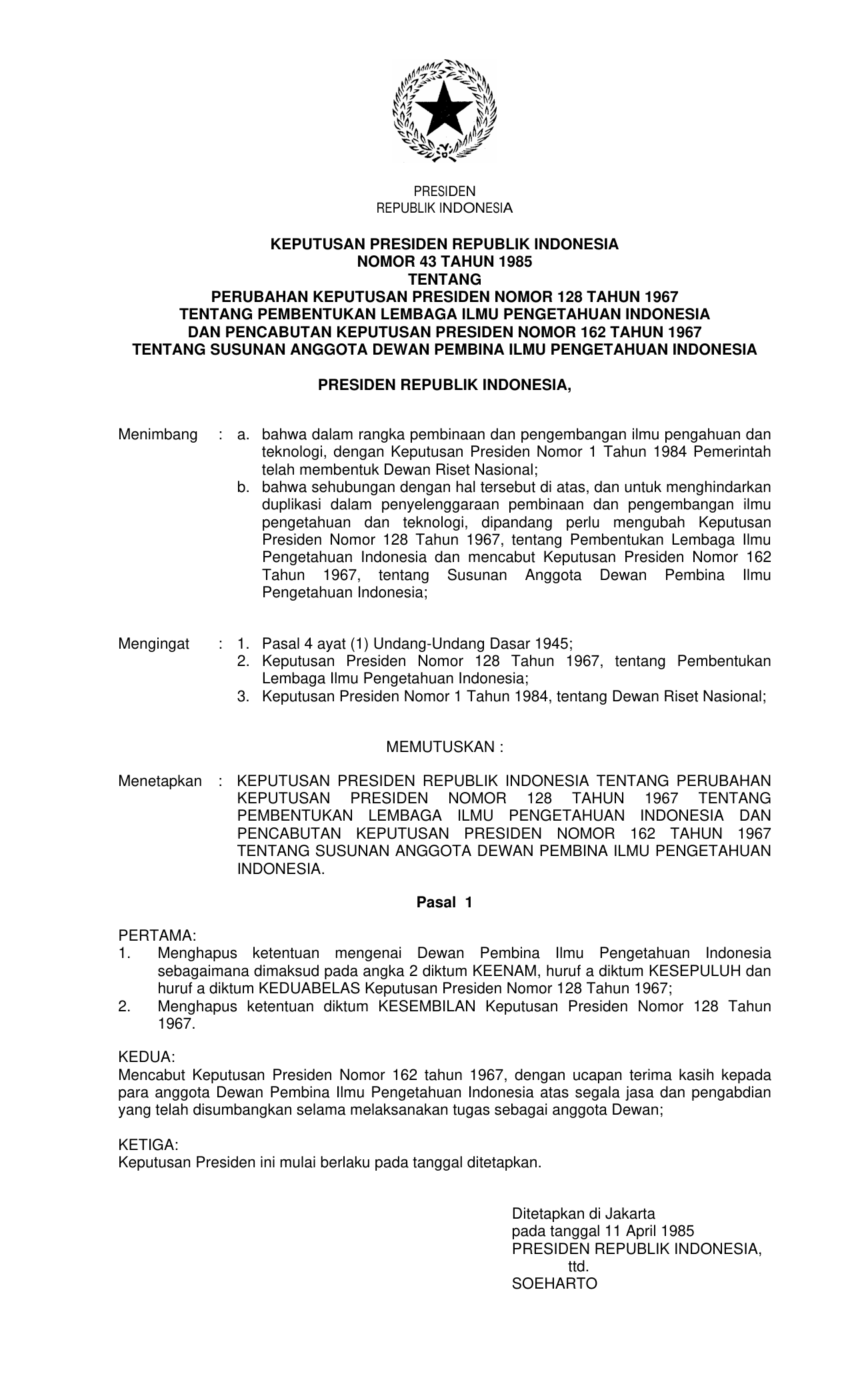 KEPPRES Nomor 43 Tahun 1985 | Keputusan Presiden Nomor 43 Tahun 1985 tentang PERUBAHAN KEPUTUSAN NOMOR 128 TAHUN 1967 TENTANG PEMBENTUKAN LIPI DAN PENCABUTAN KEPUTUSAN PRESIDEN NOMOR 162 TAHUN 1967 TENTANG SUSUNAN ANGGOTA DPIPI