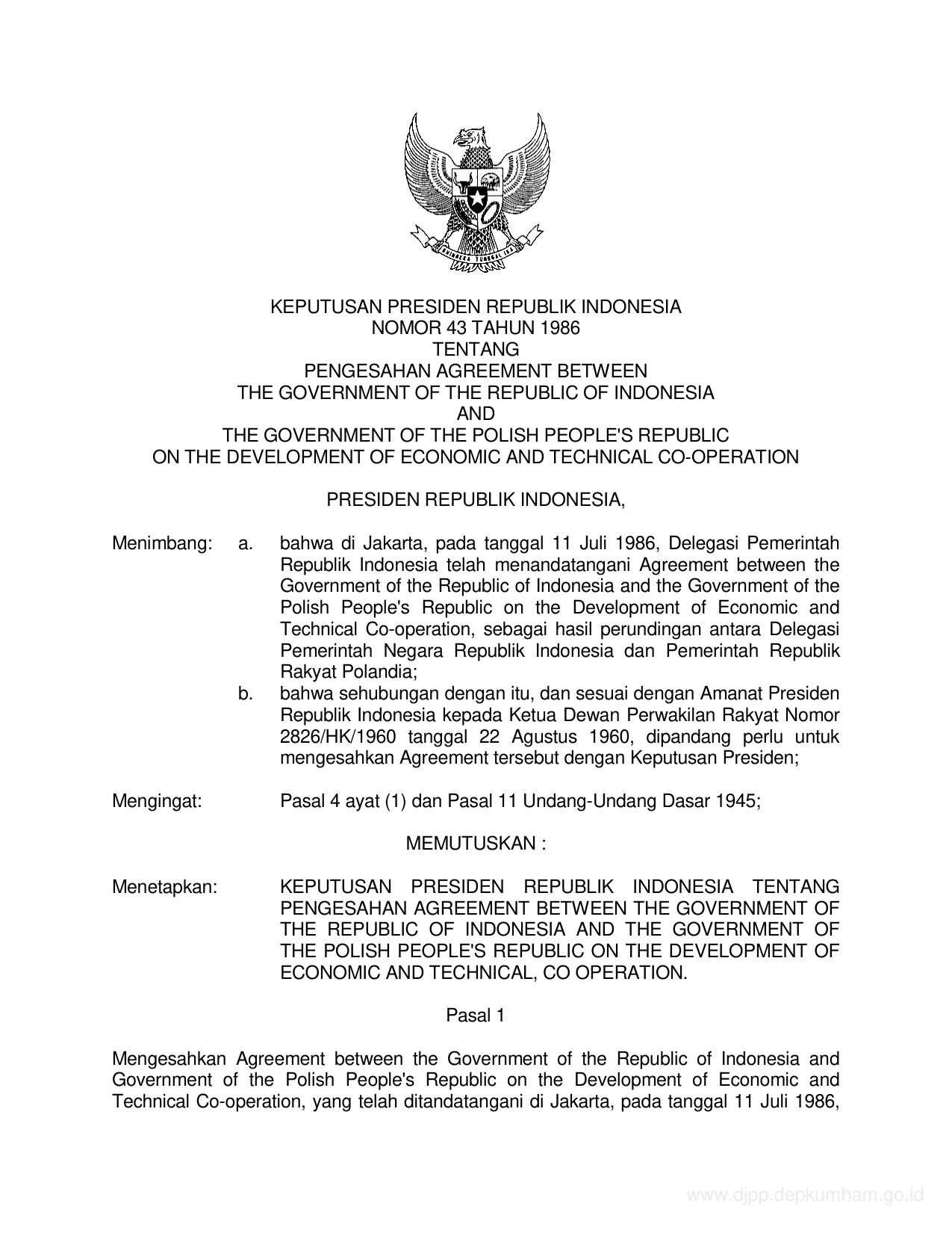 KEPPRES Nomor 43 Tahun 1986 | Keputusan Presiden Nomor 43 Tahun 1986 tentang PENGESAHAN AGREEMENT BETWEEN THE GOVERNMENT OF THE REPUBLIC OF INDONESIA AND THE GOVERNMENT OF THE POLISH PEOPLE'S REPUBLIC ON THE REPUBLIC ON THE DEVELOPMENT OF ECONOMIC AND TECHNICAL COOPERATION