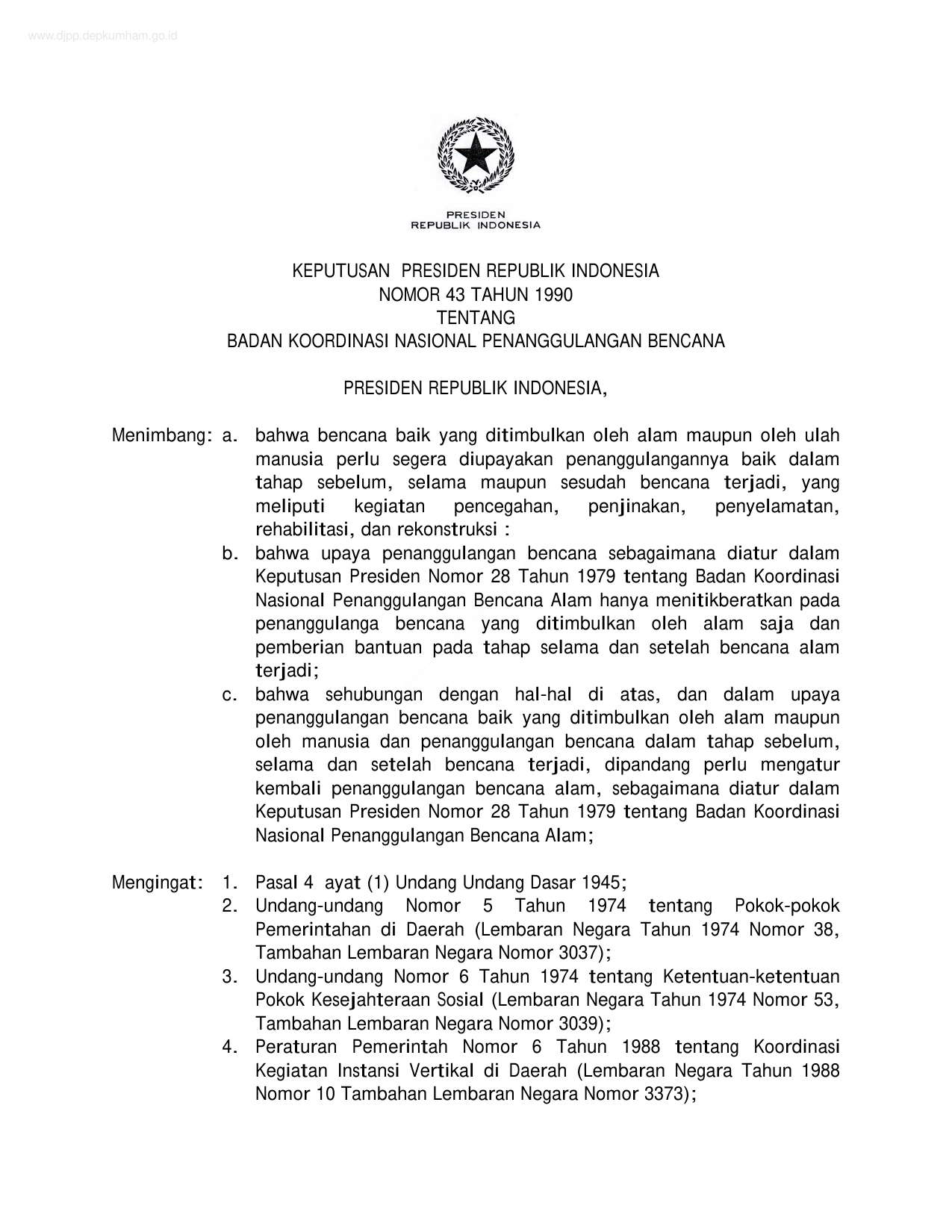 KEPPRES Nomor 43 Tahun 1990 | Keputusan Presiden Nomor 43 Tahun 1990 tentang BADAN KOORDINASI NASIONAL PENANGGULANGAN BENCANA