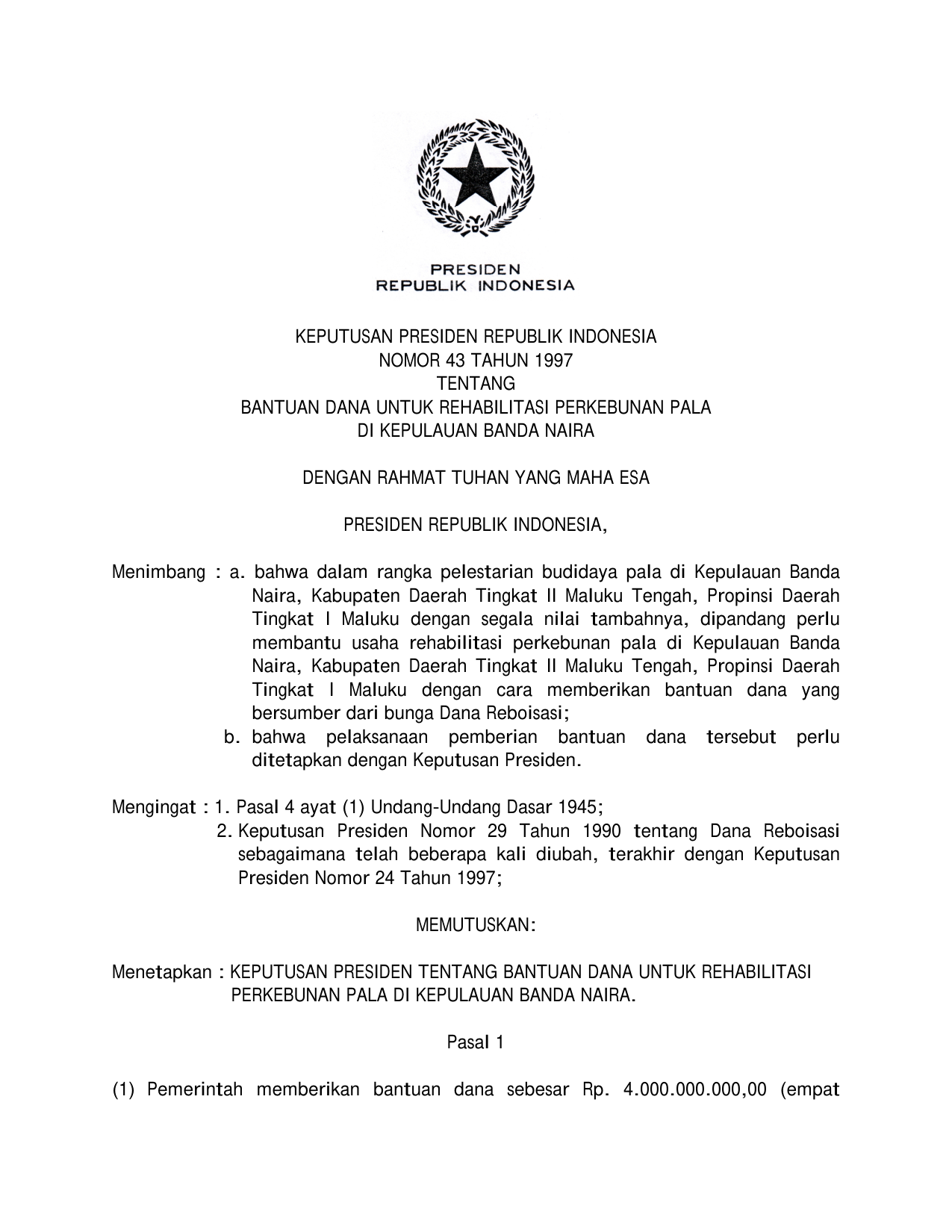 KEPPRES Nomor 43 Tahun 1997 | Keputusan Presiden Nomor 43 Tahun 1997 tentang BANTUAN DANA UNTUK REHABILITASI PERKEBUNAN PALA DI KEPULAUAN BANDA NAIRA