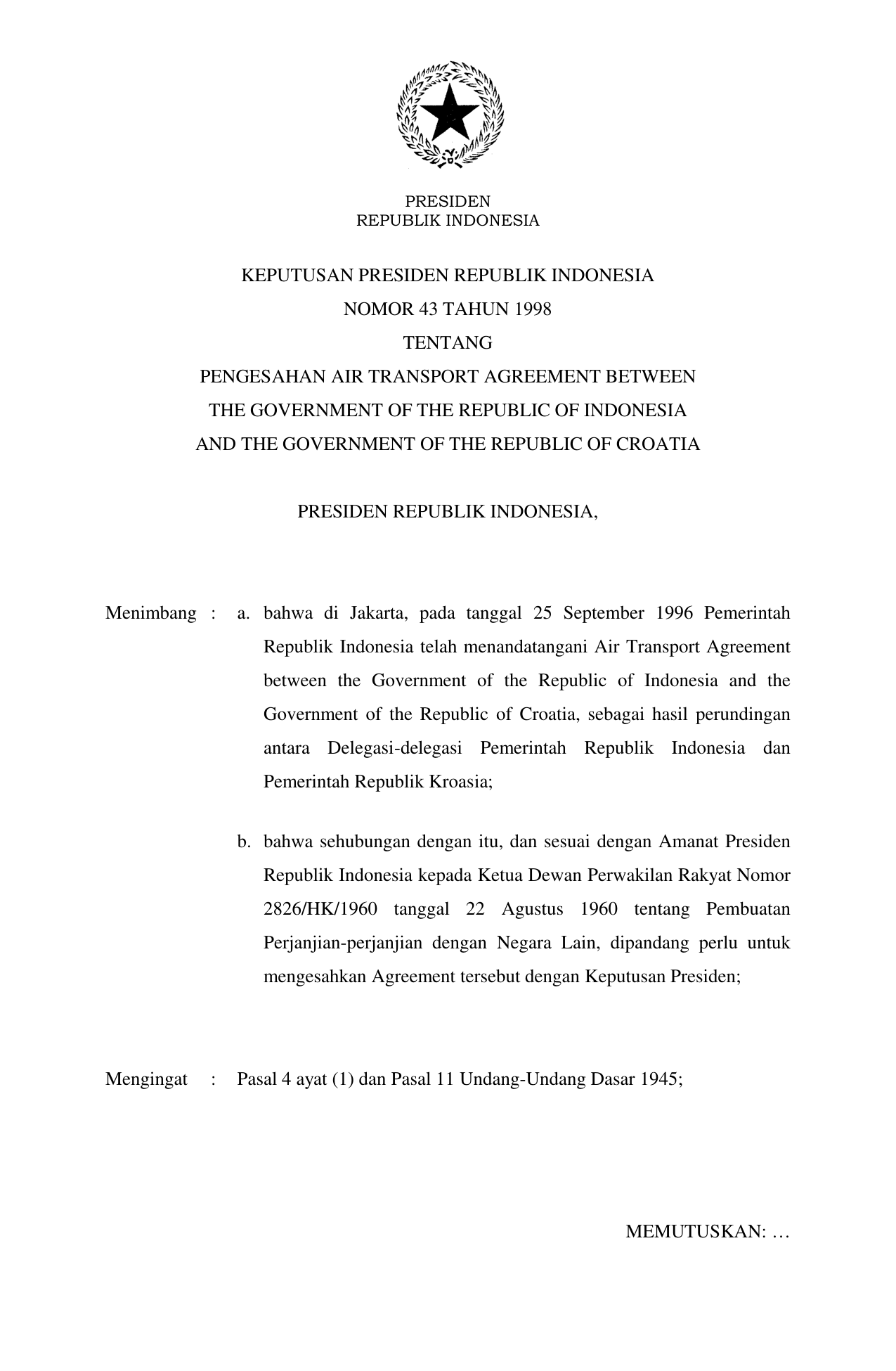 KEPPRES Nomor 43 Tahun 1998 | Keputusan Presiden Nomor 43 Tahun 1998 tentang PENGESAHAN AIR TRANSPORT AGREEMENT BETWEEN THE GOVERNMENT OF THE REPUBLIC OF INDONESIA AND THE GOVERNMENT OF THE REPUBLIC OF CROATIA