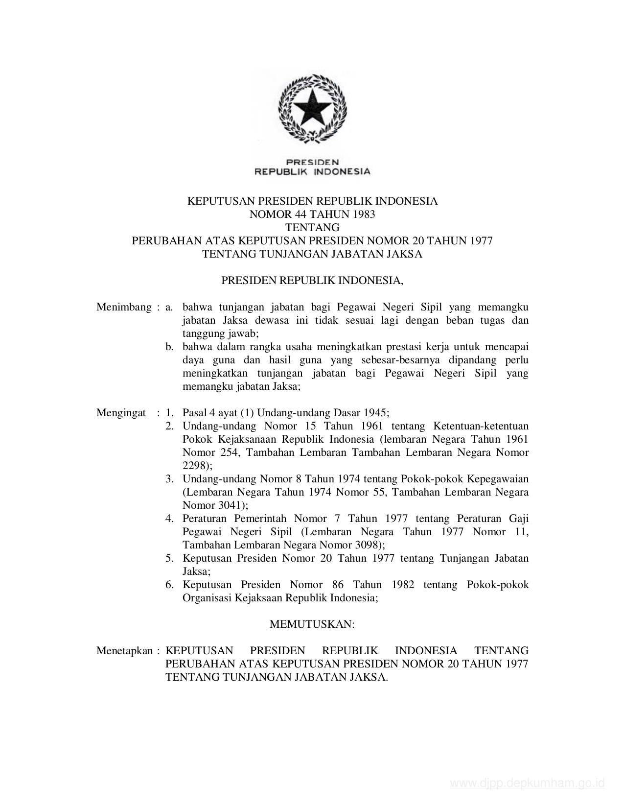 KEPPRES Nomor 44 Tahun 1983 | Keputusan Presiden Nomor 44 Tahun 1983 tentang PERUBAHAN ATAS KEPUTUSAN PRESIDEN NOMOR 20 TAHUN 1977 TENTANG TUNJANGAN JABATAN JAKSA