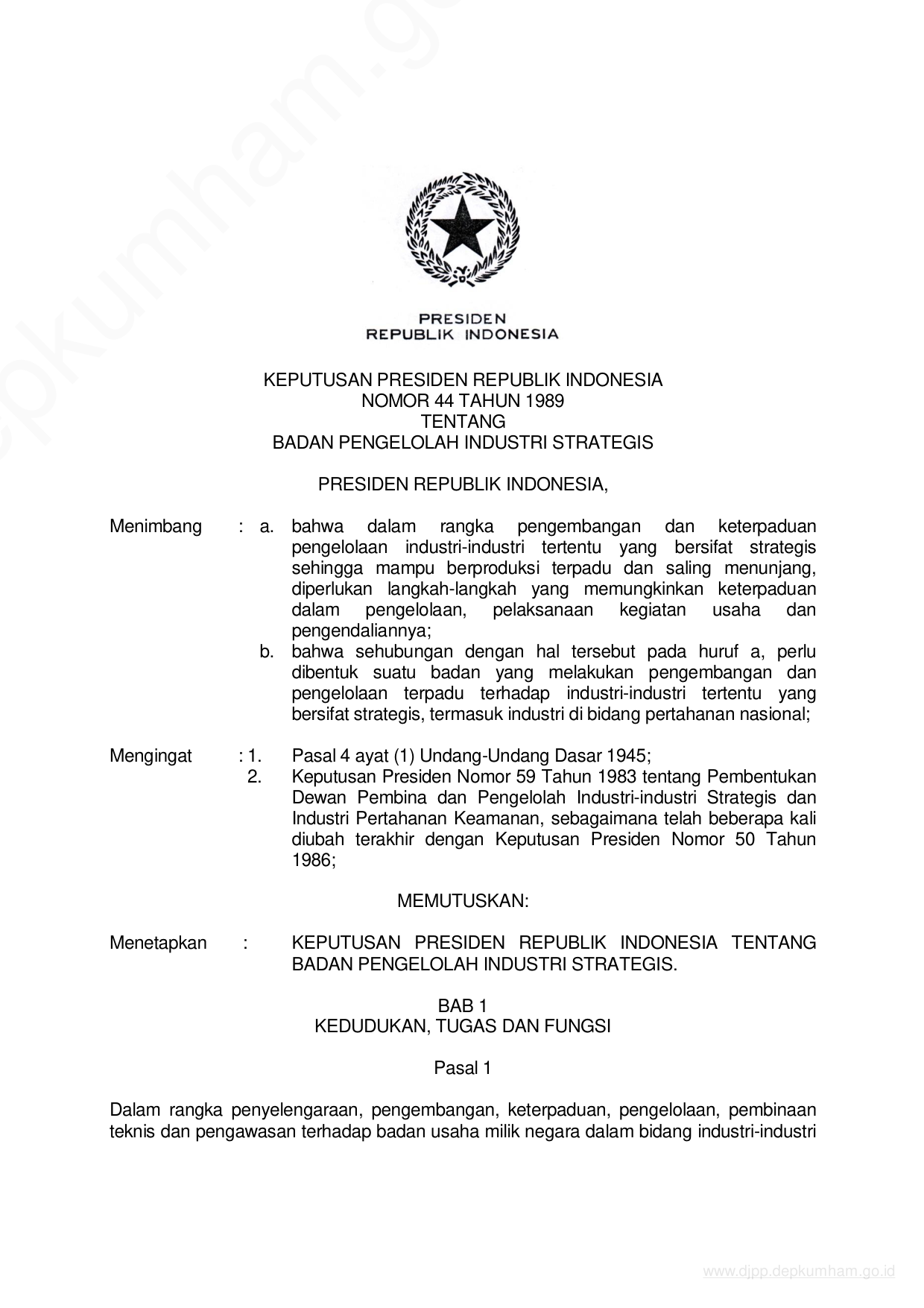KEPPRES Nomor 44 Tahun 1989 | Keputusan Presiden Nomor 44 Tahun 1989 tentang BADAN PENGELOLA INDUSTRI STRETEGIS