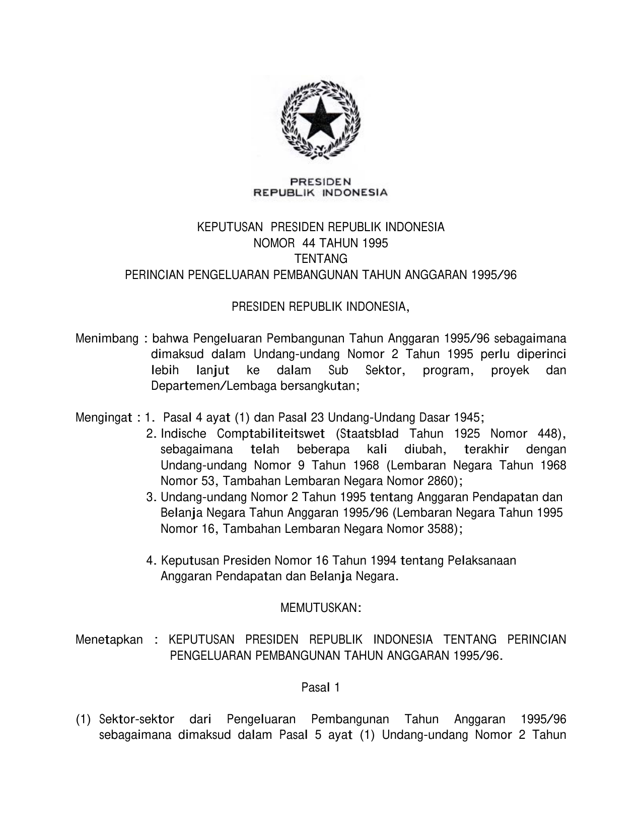 KEPPRES Nomor 44 Tahun 1995 | Keputusan Presiden Nomor 44 Tahun 1995 tentang PERINCIAN PENGELUARAN PEMBANGUNAN TAHUN ANGGARAN 1995/1996
