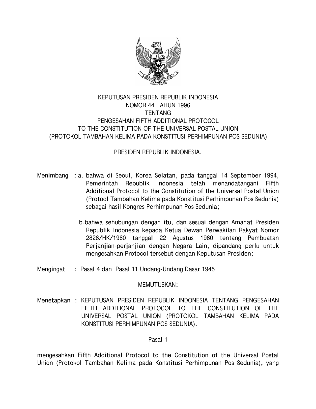 Para wakil berkuasa penuh pemerintah negara-negara anggota Perhimpunan Pos sedunia yangbersidang pada Kongres di Seoul, sesuai dengan Pasal 30 ayat 2 Konstitusi perhimpunan Pos sedunia yag disetujui di Wina tanggal 10 Juli 1964, telah menerima untuk meratifikasi, peruahan-perubahan berikut pada Konstitusi.