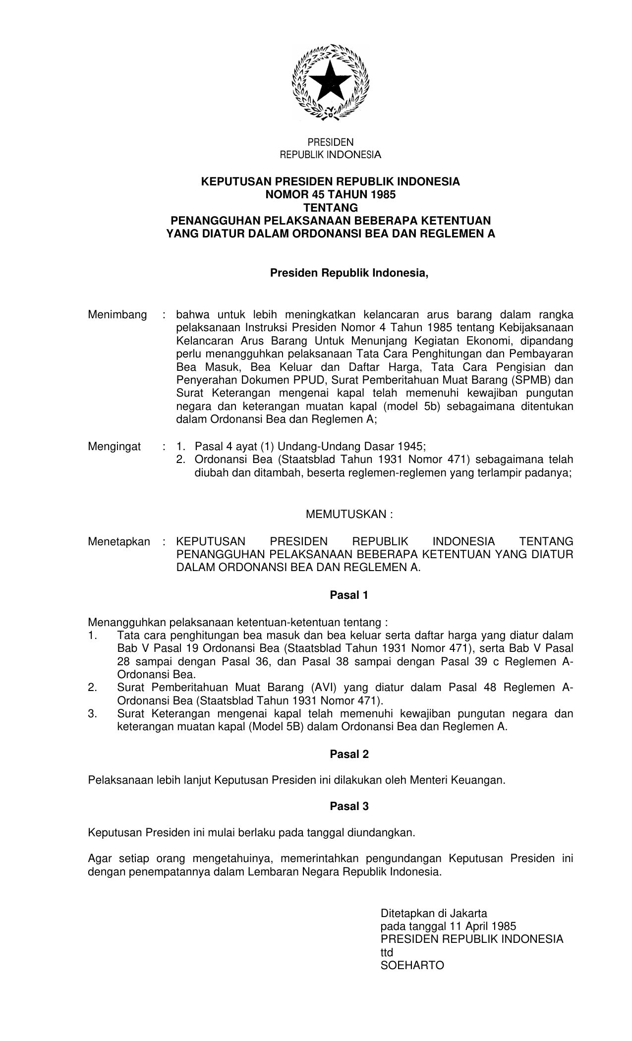 KEPPRES Nomor 45 Tahun 1985 | Keputusan Presiden Nomor 45 Tahun 1985 tentang PENANGGUHAN PELAKSSANAAN BEBERAPA KETENTUAN YANG DIATUR DALAM ORDONANSI BEA DAN REGLEMEN
