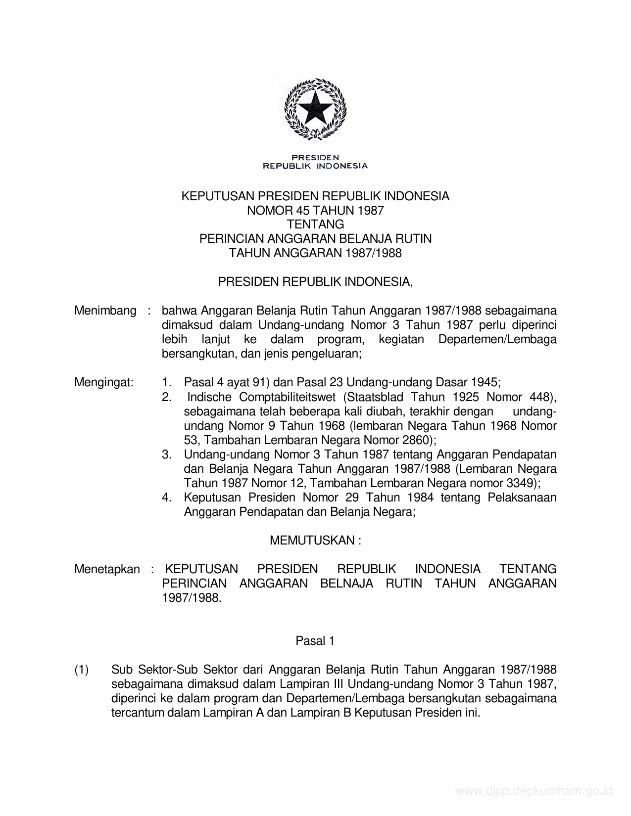 KEPPRES Nomor 45 Tahun 1987 | Keputusan Presiden Nomor 45 Tahun 1987 tentang PERINCIAN ANGGARAN BELANJA RUTIN TAHUN ANGGARAN 1987/1988
