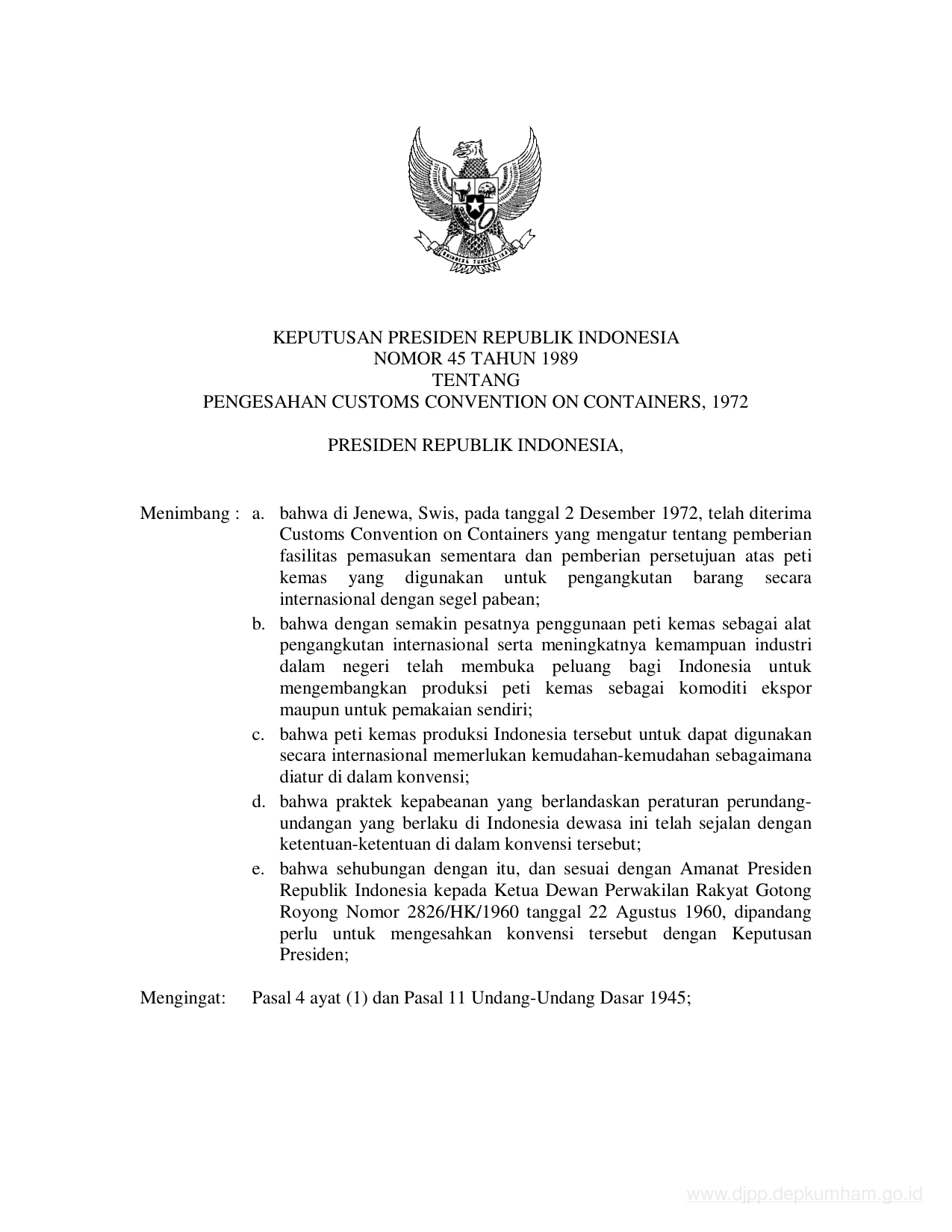 KEPPRES Nomor 45 Tahun 1989 | Keputusan Presiden Nomor 45 Tahun 1989 tentang PENGESAHAN COSTUM CONVENTION ON CONTAINER, 1972