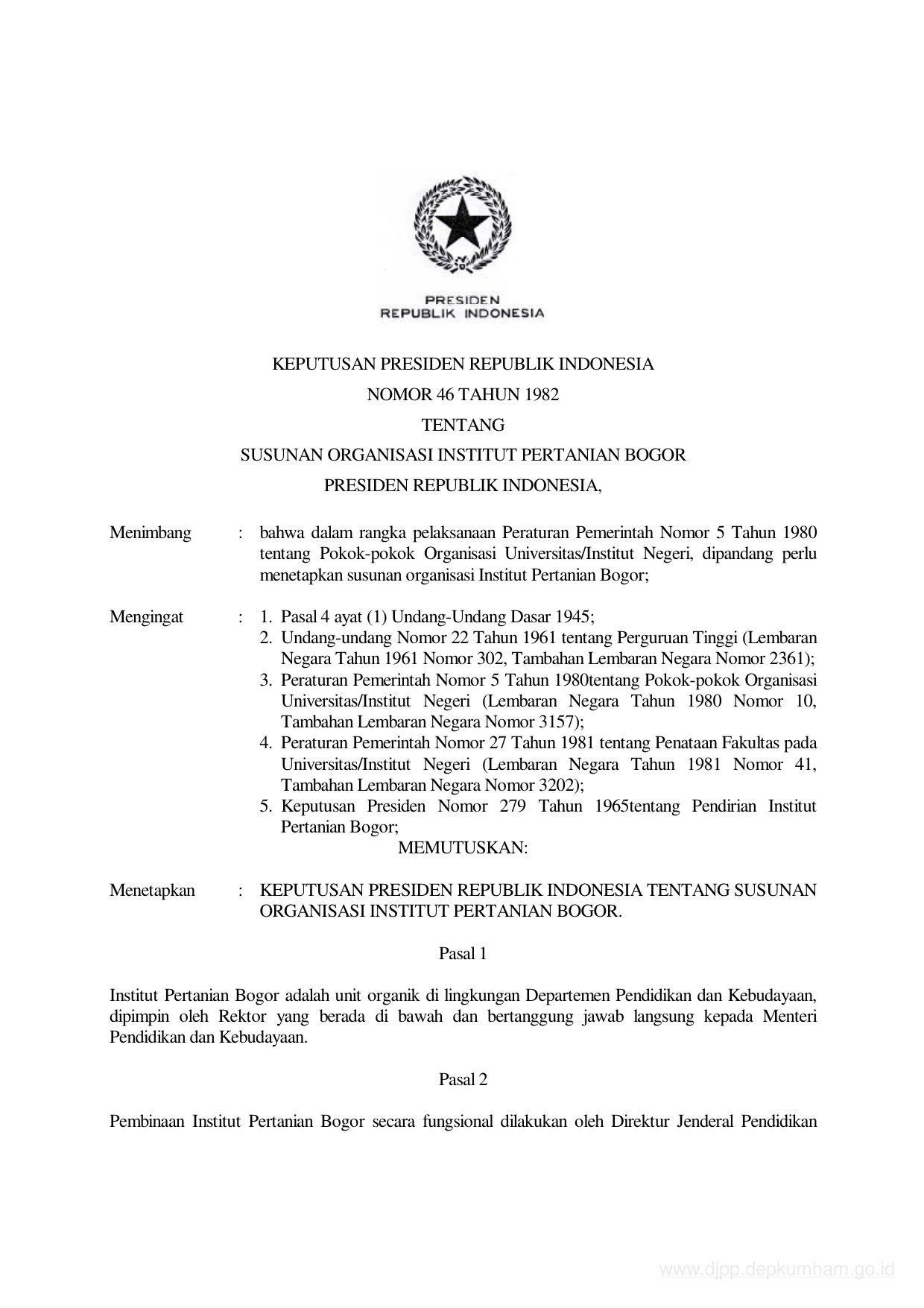 KEPPRES Nomor 46 Tahun 1982 | Keputusan Presiden Nomor 46 Tahun 1982 tentang SUSUNAN ORGANISASI INSTITUT PERTANIAN BOGOR