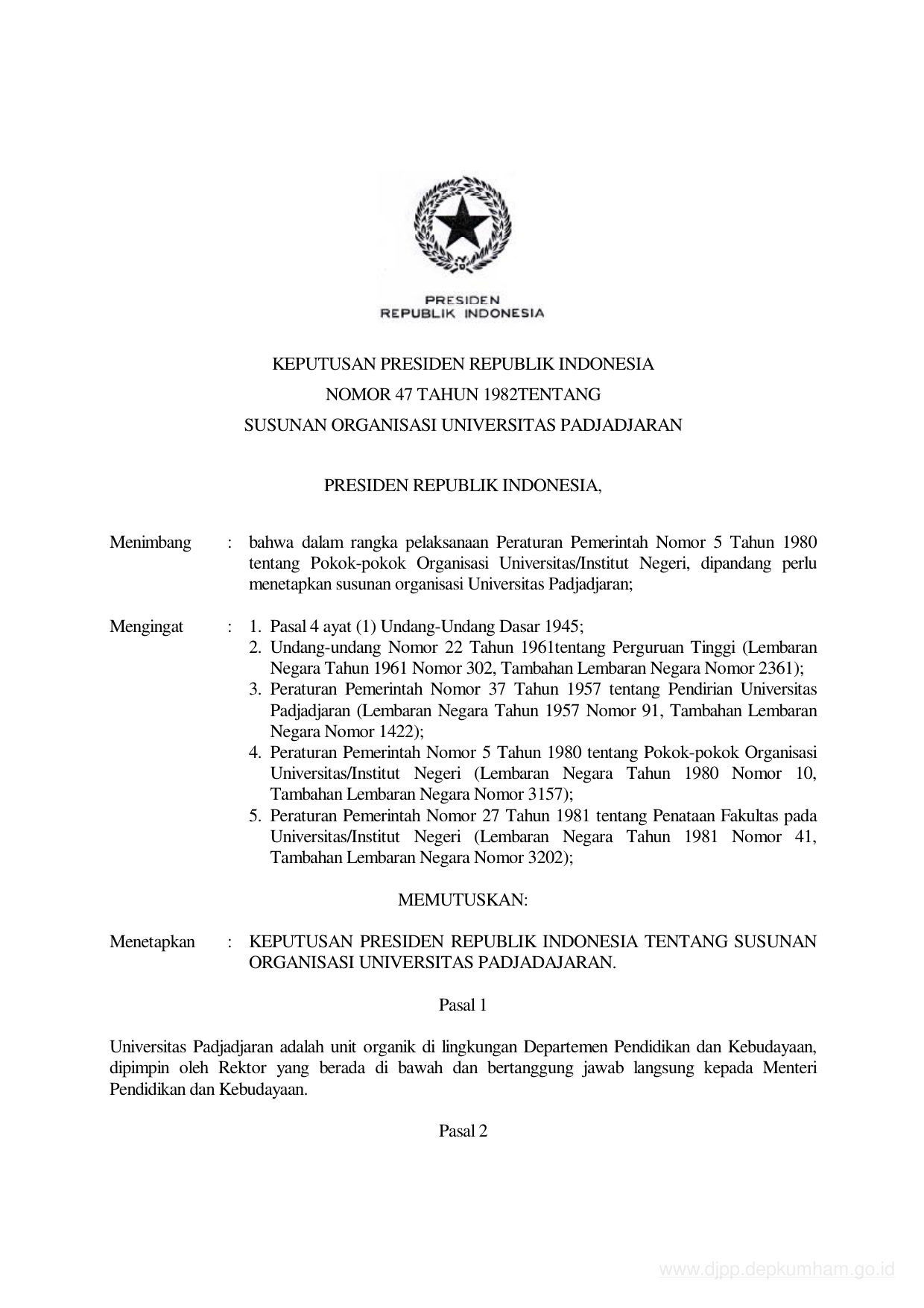 KEPPRES Nomor 47 Tahun 1982 | Keputusan Presiden Nomor 47 Tahun 1982 tentang SUSUNAN ORGANISASI UNIVERSITAS PADJAJARAN