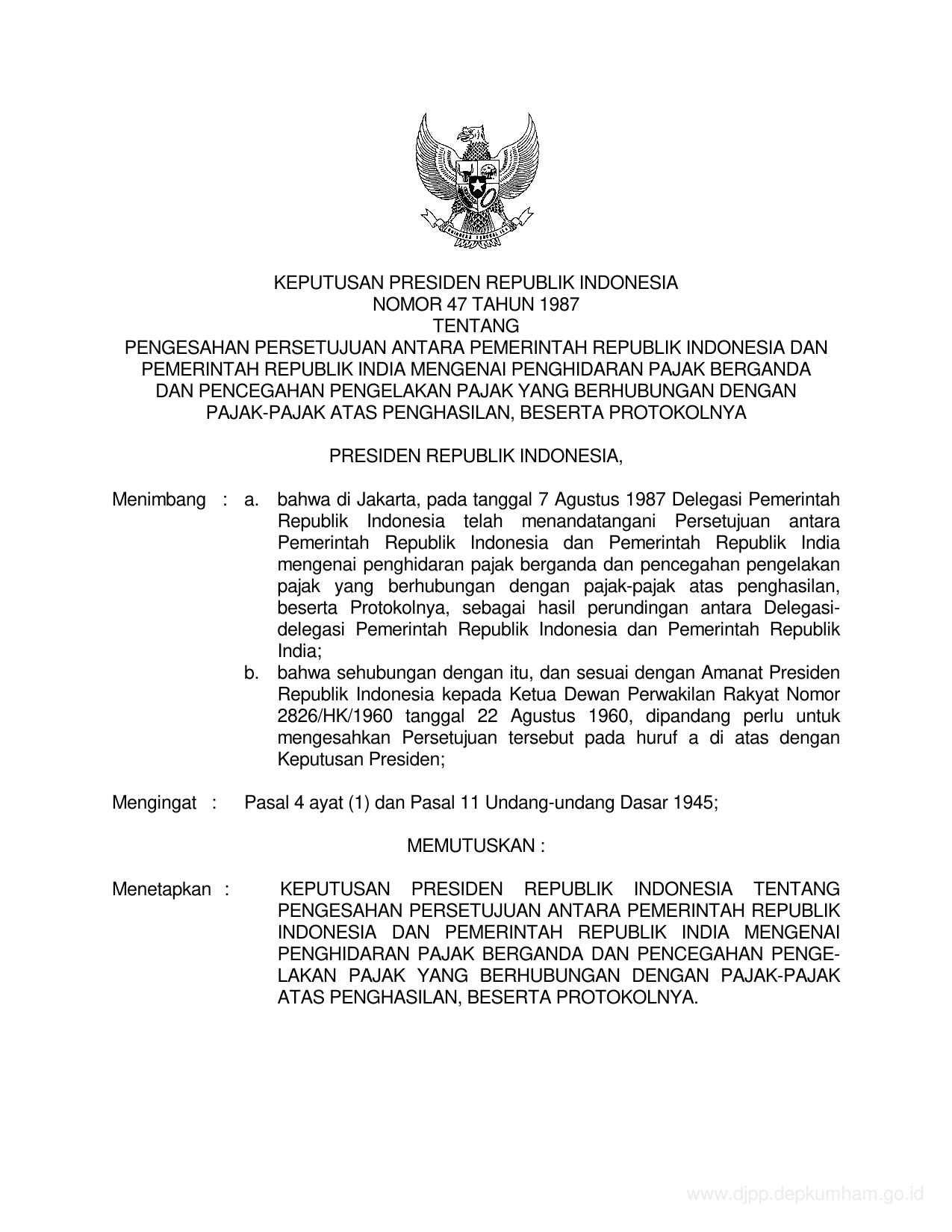 KEPPRES Nomor 47 Tahun 1987 | Keputusan Presiden Nomor 47 Tahun 1987 tentang PENGESAHAN PERSETUJUAN ANTARA PEMERINTAH RI DAN PEMERINTAH REPUBLIK INDIA MENGENAI PENGHINDARAN PAJAK BERGANDA DAN PENCEGAHAN PENGELAKAN PAJAK YANG BERHUBUNGAN DENGAN PAJAK-PAJAK ATAS PENGHASILAN BESERTA PROTOKOLNYA