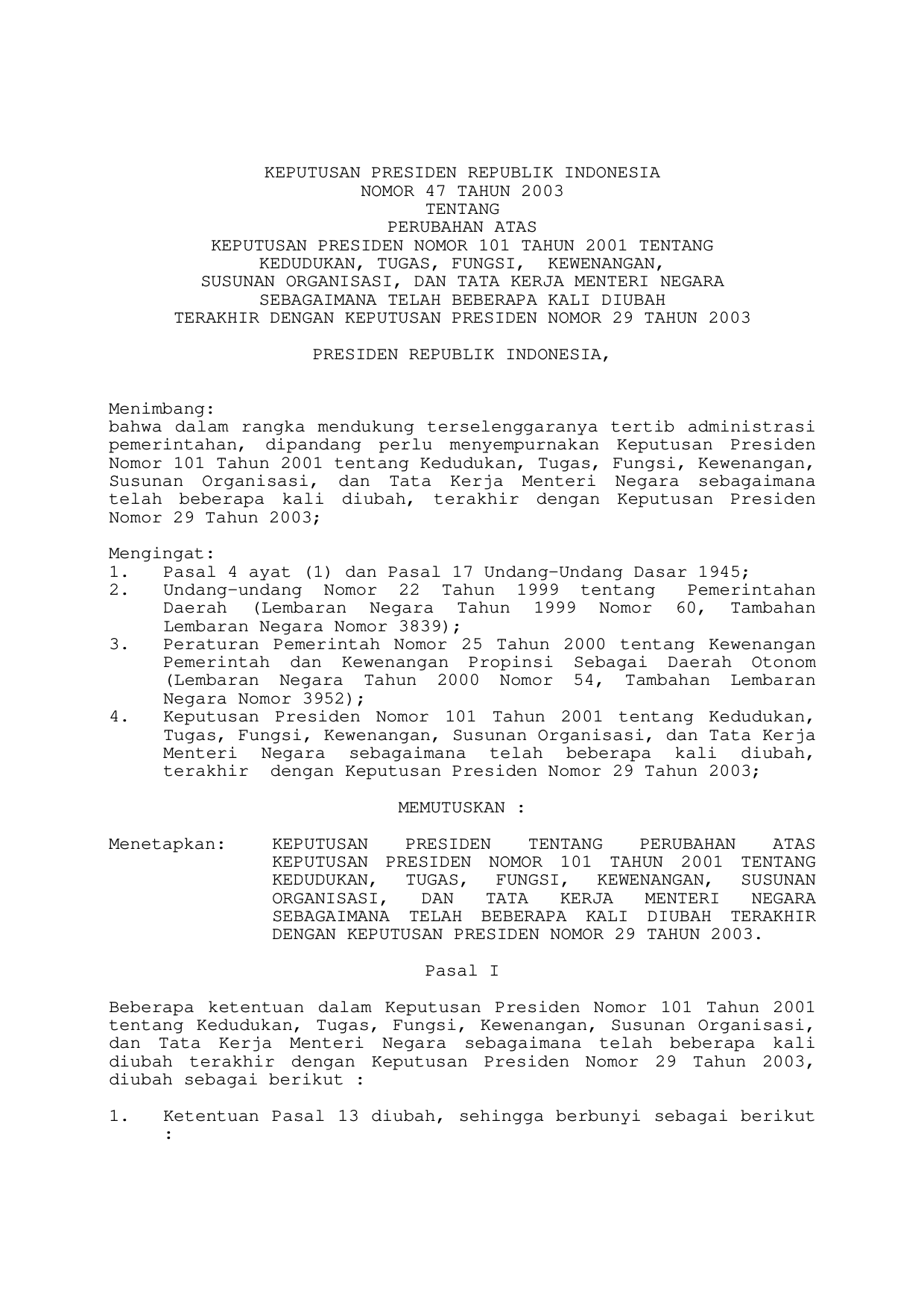 KEPPRES Nomor 47 Tahun 2003 | Keputusan Presiden Nomor 47 Tahun 2003 tentang PERUBAHAN KEPPRES 101-2001 TENTANG KEDUDUKAN, TUGAS, FUNGSI, KEWENANGAN, SUSUNAN ORGANISASI, DAN TATA KERJA MENTERI NEGARA SEBAGAIMANA TELAH BEBERAPA KALI DIUBAH TERAKHIR DENGAN KEPPRES 29-2003
