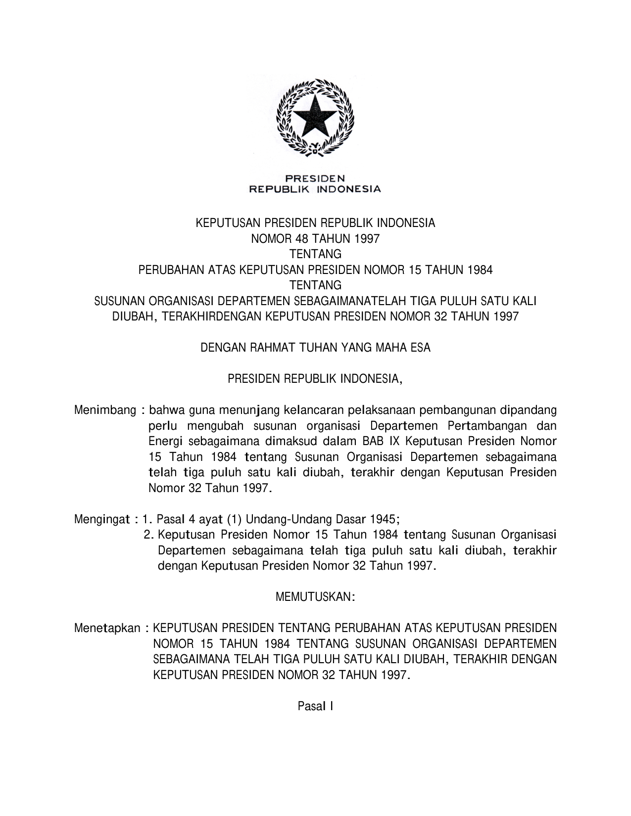 KEPPRES Nomor 48 Tahun 1997 | Keputusan Presiden Nomor 48 Tahun 1997 tentang PERUBAHAN KEPPRES 15-1984 TENTANG SUSUNAN ORGANISASI DEPARTEMEN SEBAGAIMANA TELAH TIGA PULUH SATU KALI DIUBAH, TERAKHIR DENGAN KEPPRES 32-1997