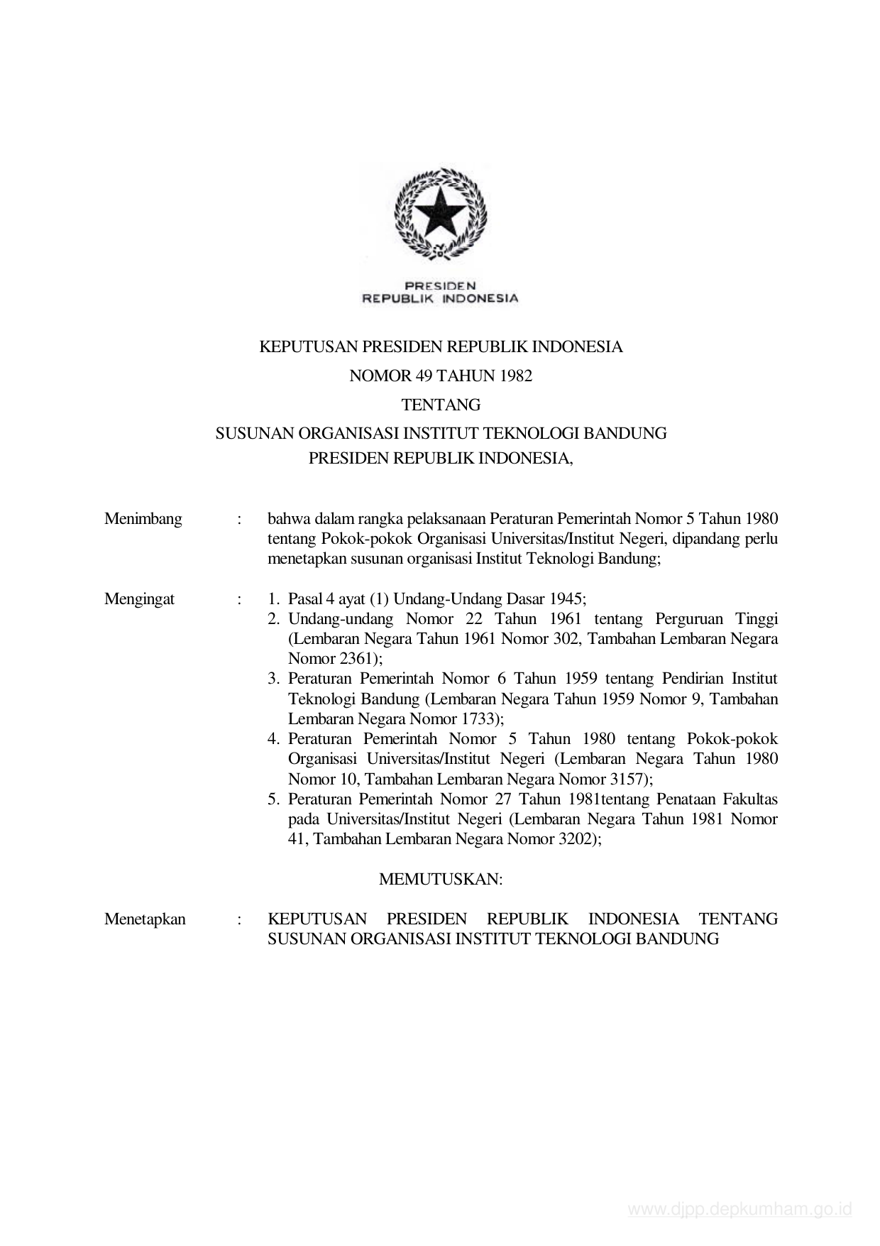 KEPPRES Nomor 49 Tahun 1982 | Keputusan Presiden Nomor 49 Tahun 1982 tentang SUSUNAN ORGANISASI INSTITUT TEKNOLOGI BANDUNG