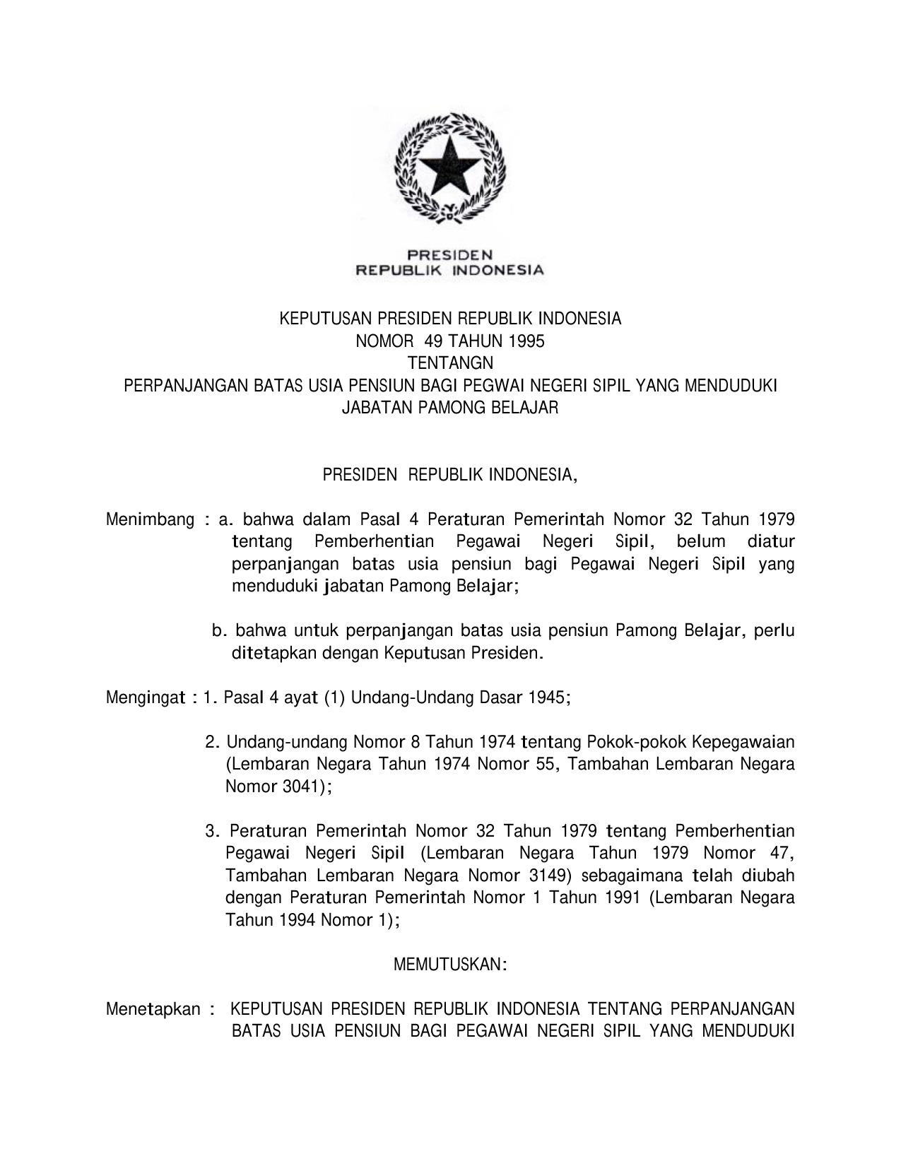 KEPPRES Nomor 49 Tahun 1995 | Keputusan Presiden Nomor 49 Tahun 1995 tentang PERPANJANGAN BATAS USIA PENSIUN BAGI PEGAWAI NEGERI SIPIL YANG MENDUDUKI JABATAN PAMONG BELAJAR