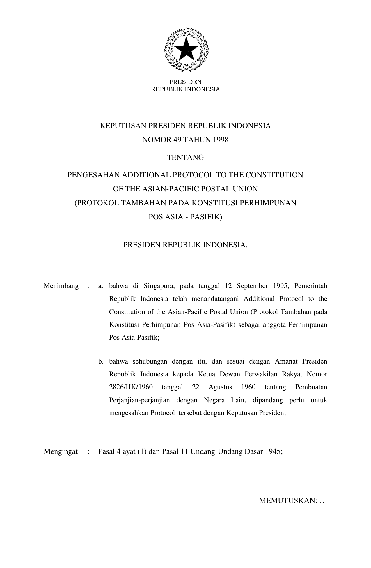 KEPPRES Nomor 49 Tahun 1998 | Keputusan Presiden Nomor 49 Tahun 1998 tentang PENGESAHAN ADDITIONAL PROTOCOL TO THE CONSTITUTION OF THE ASIAN-PACIFIC POSTAL UNION (PROTOKOL TAMBAHAN PADA KONSTITUSI PERHIMPUNAN POS ASIA - PASIFIK)