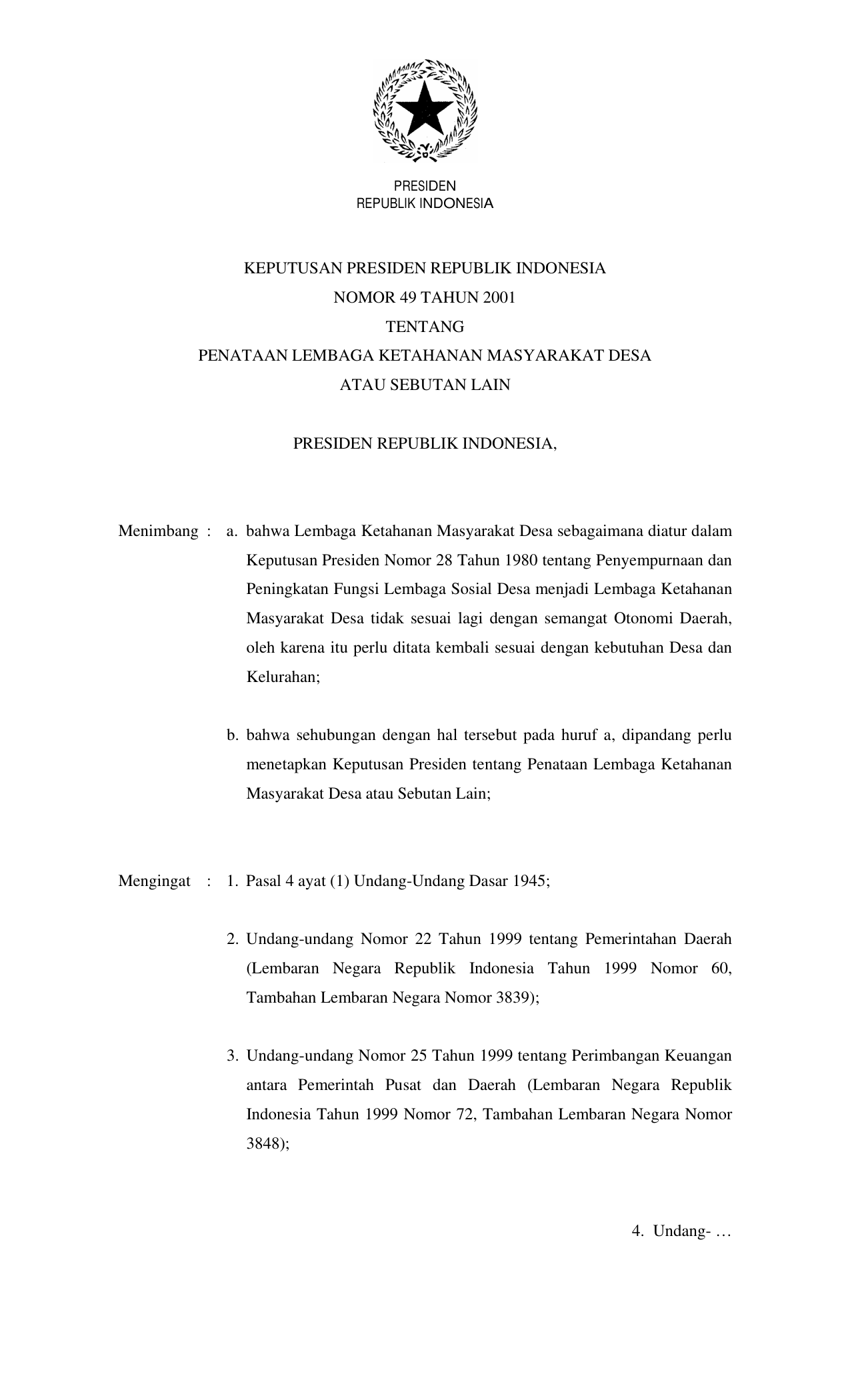 KEPPRES Nomor 49 Tahun 2001 | Keputusan Presiden Nomor 49 Tahun 2001 tentang PENATAAN LEMBAGA KETAHANAN MASYARAKAT DESA ATAU SEBUTAN LAIN