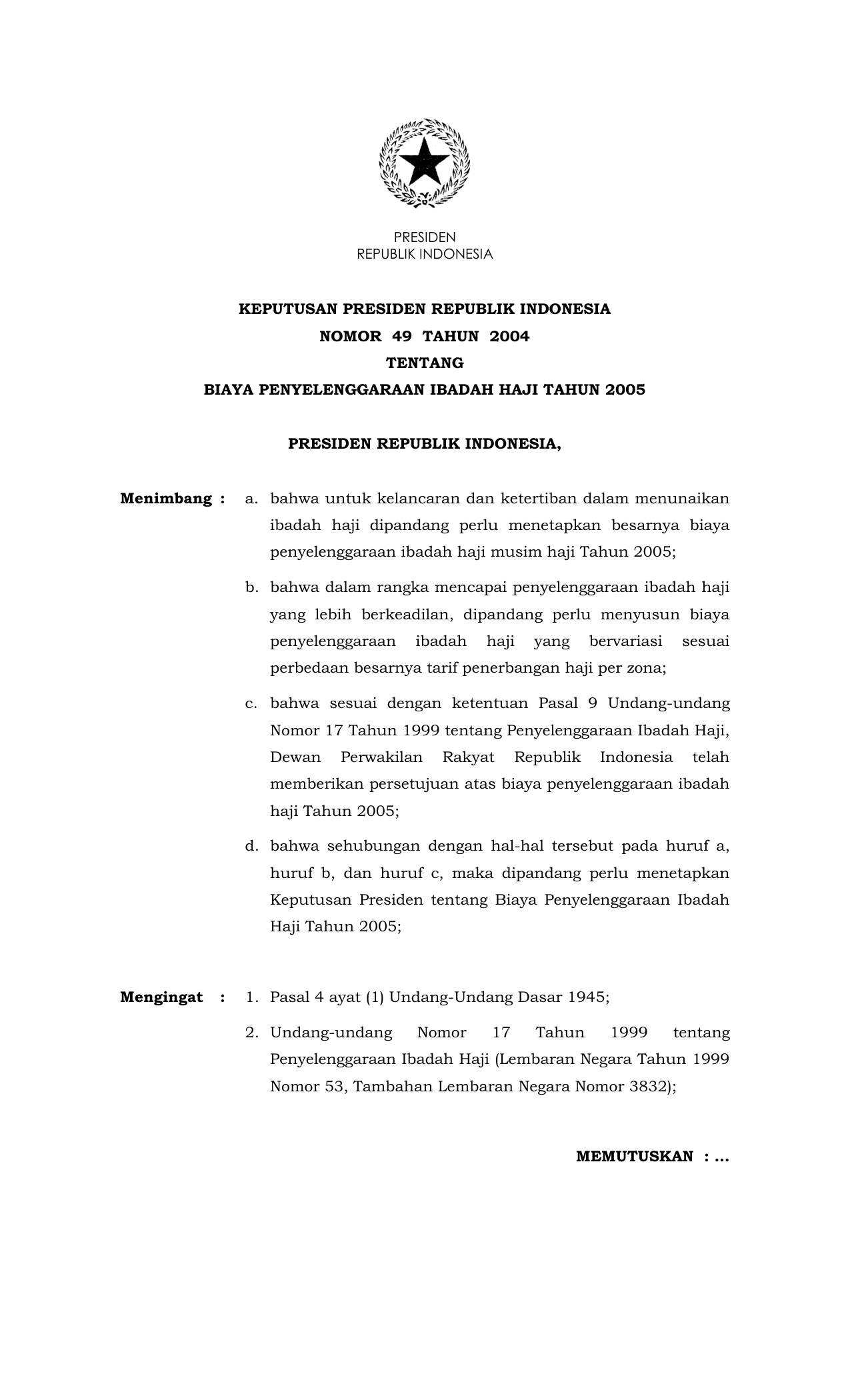 KEPPRES Nomor 49 Tahun 2004 | Keputusan Presiden Nomor 49 Tahun 2004 tentang BIAYA PENYELENGGARAAN IBADAH HAJI TAHUN 2005