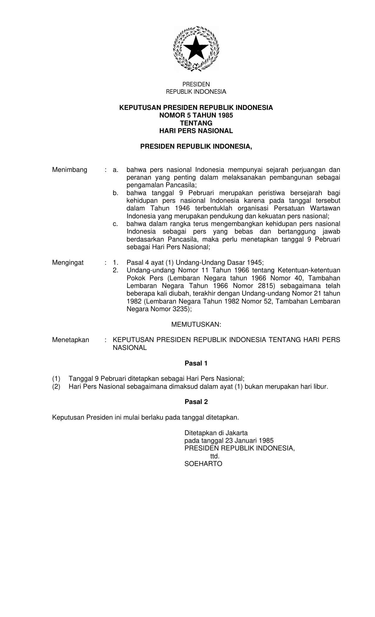 KEPPRES Nomor 5 Tahun 1985 | Keputusan Presiden Nomor 5 Tahun 1985 tentang HARI PERS NASIONAL