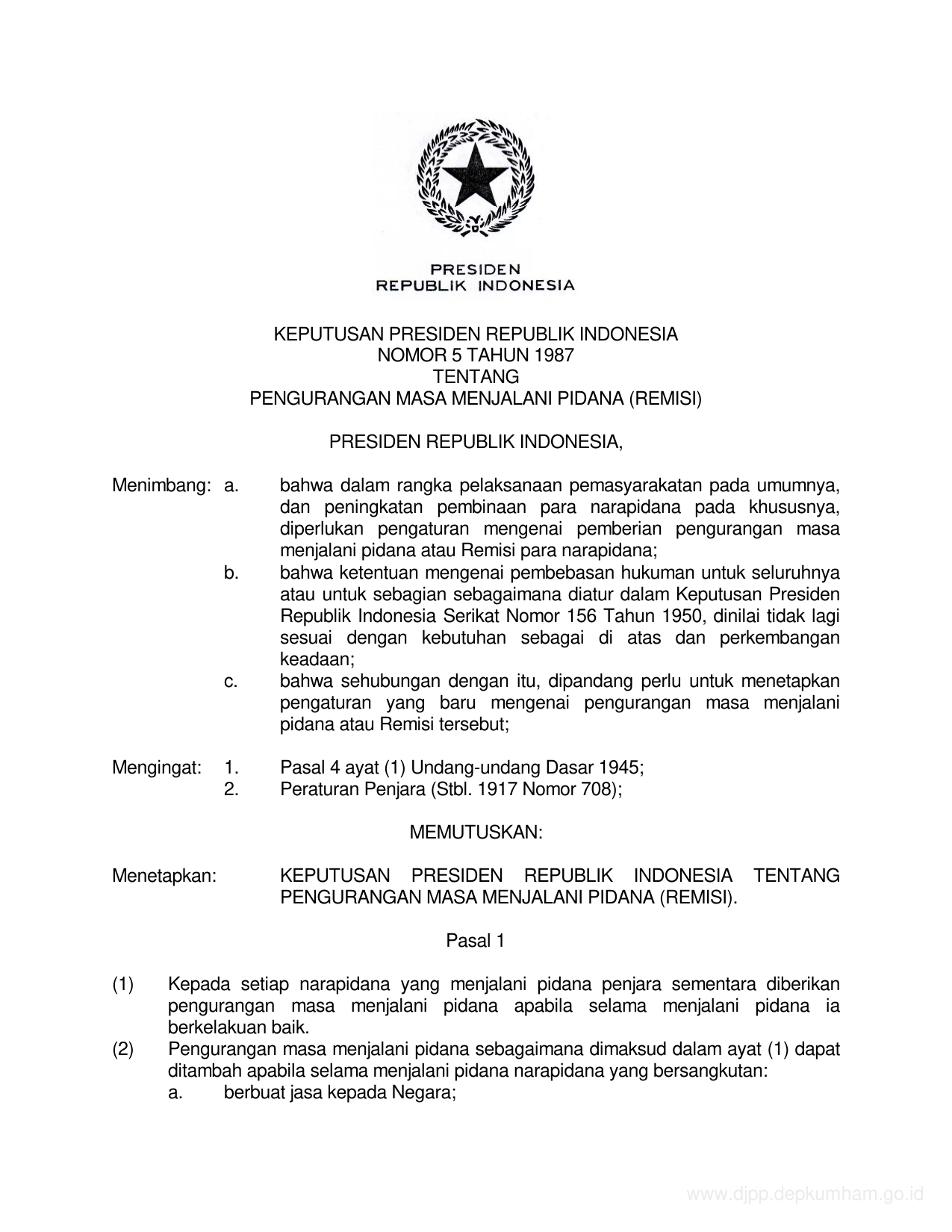 KEPPRES Nomor 5 Tahun 1987 | Keputusan Presiden Nomor 5 Tahun 1987 tentang PENGURANGAN MASA MENJALANI PIDANA (REMISI)