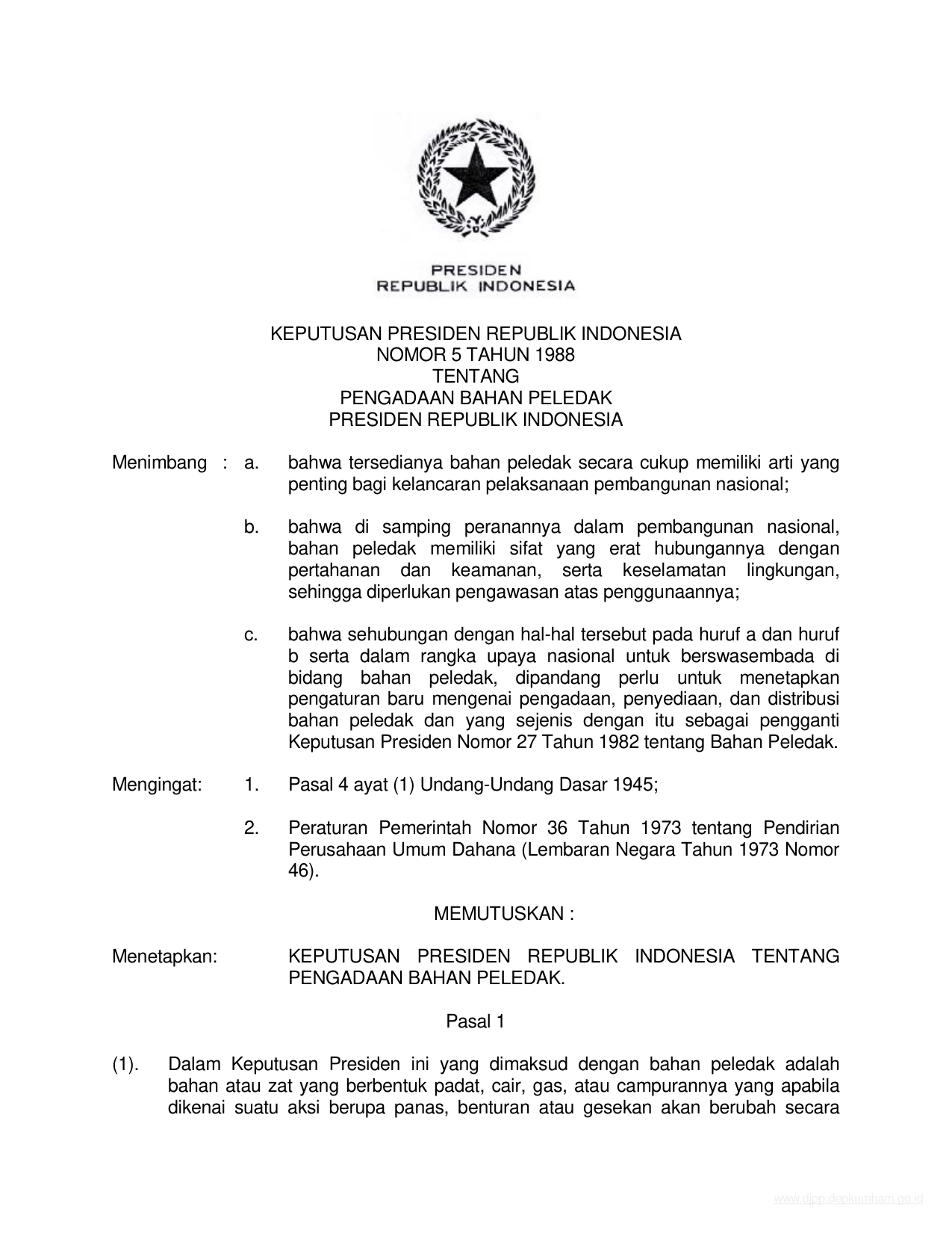 KEPPRES Nomor 5 Tahun 1988 | Keputusan Presiden Nomor 5 Tahun 1988 tentang PENGADAAN BAHAN PELEDAK